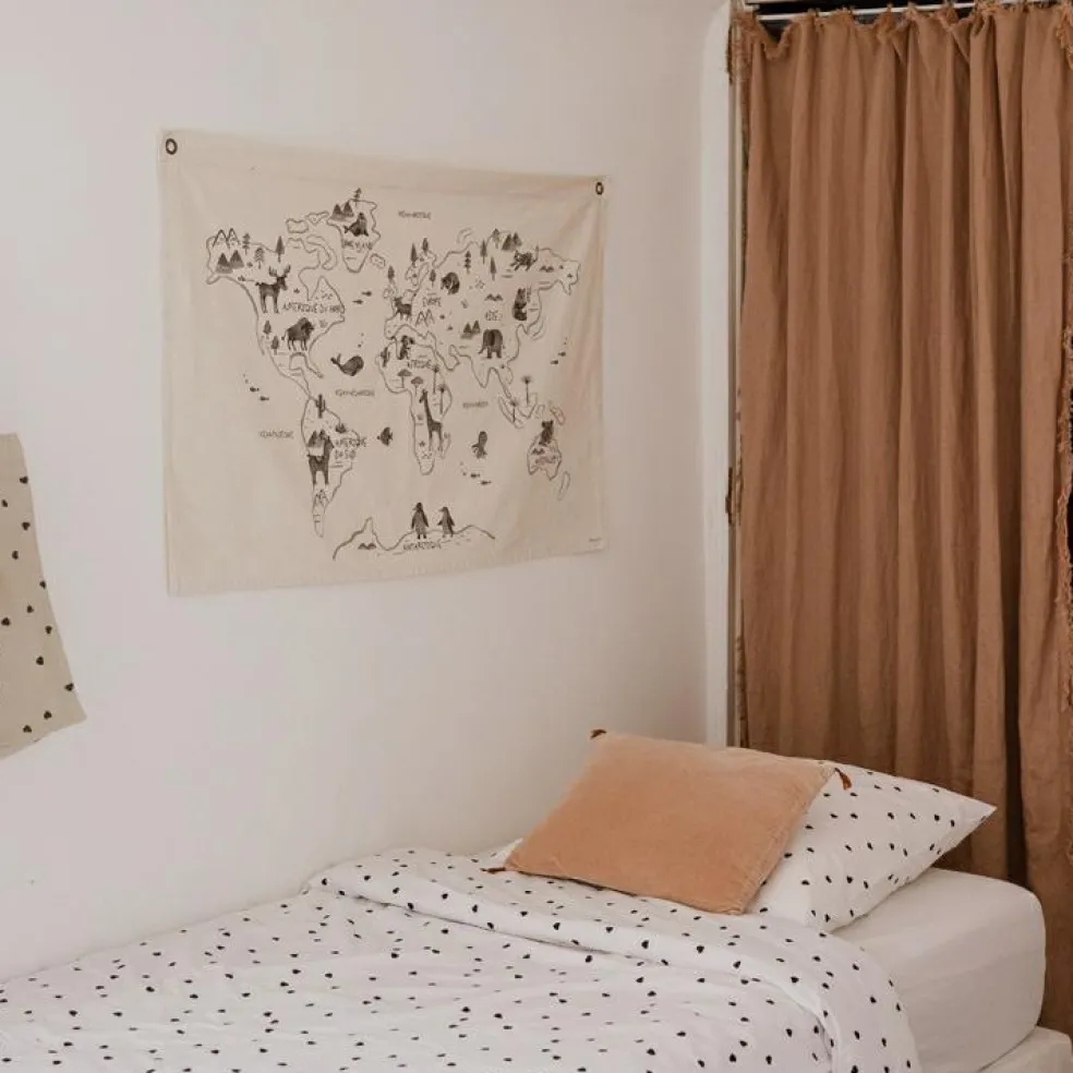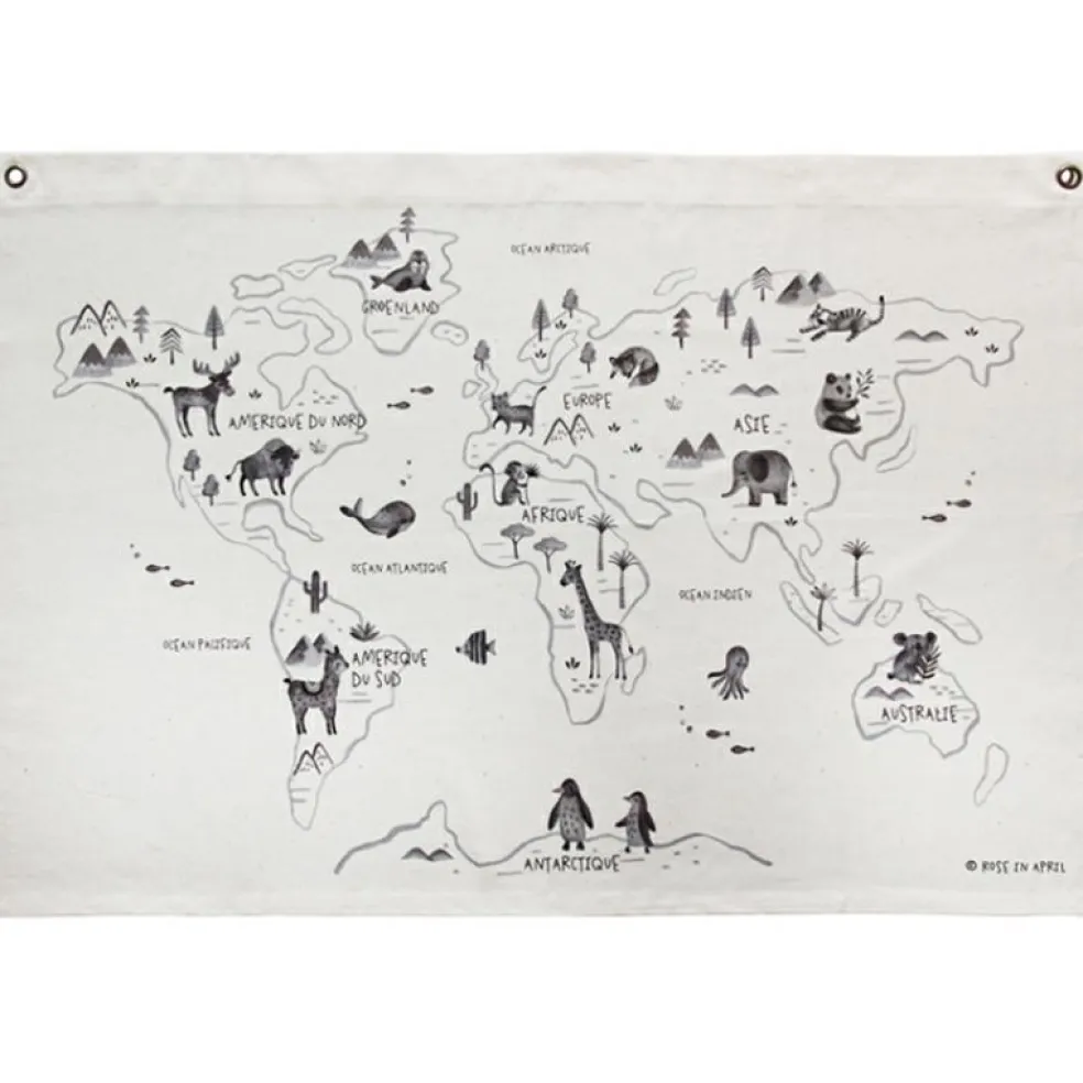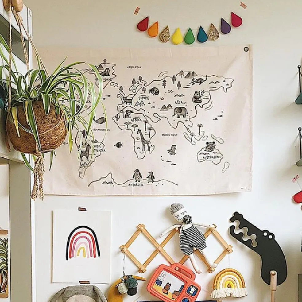 L’affiche en tissu Carte du monde de la marque Rose in April est très décorative et a en plus une véritable fonction éducative. En la voyant chaque jour, l’enfant mémorisera certaines bases de la géographie : les continents, les océans… Il découvrira aussi la faune et la flore natives aux différentes parties du monde !