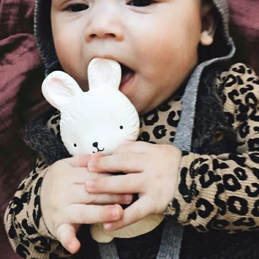 L’anneau de dentition Lapin de la marque A Little Lovely Company soulage les gencives douloureuses de bébé lorsqu’il fait ses dents.