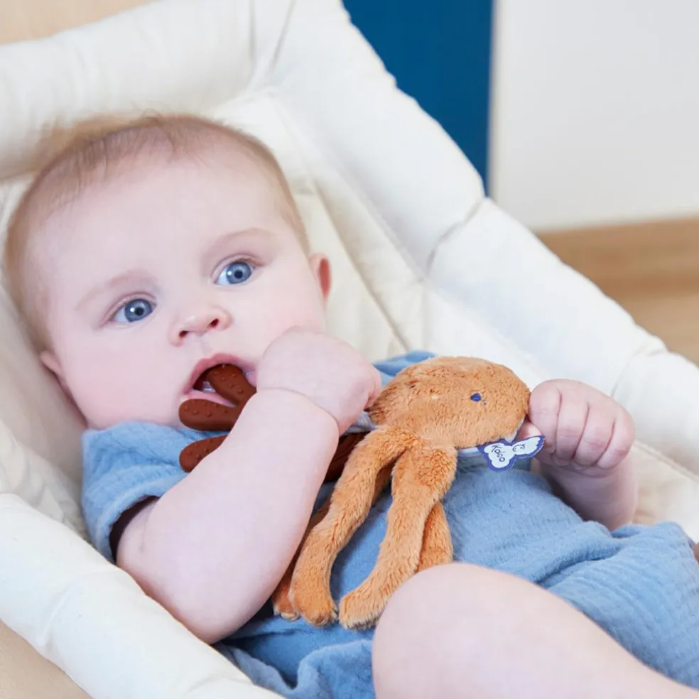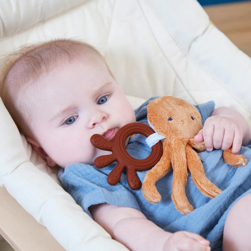 – Picots et rainures sur l’anneau pour masser les gencives de bébé.