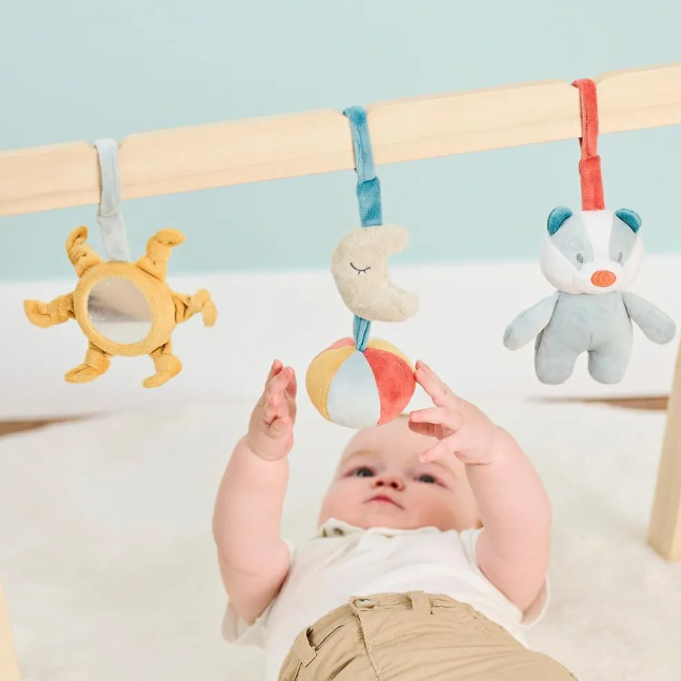– Développe la coordination des mouvements, améliore la motricité et stimule les sens et la curiosité du bébé.