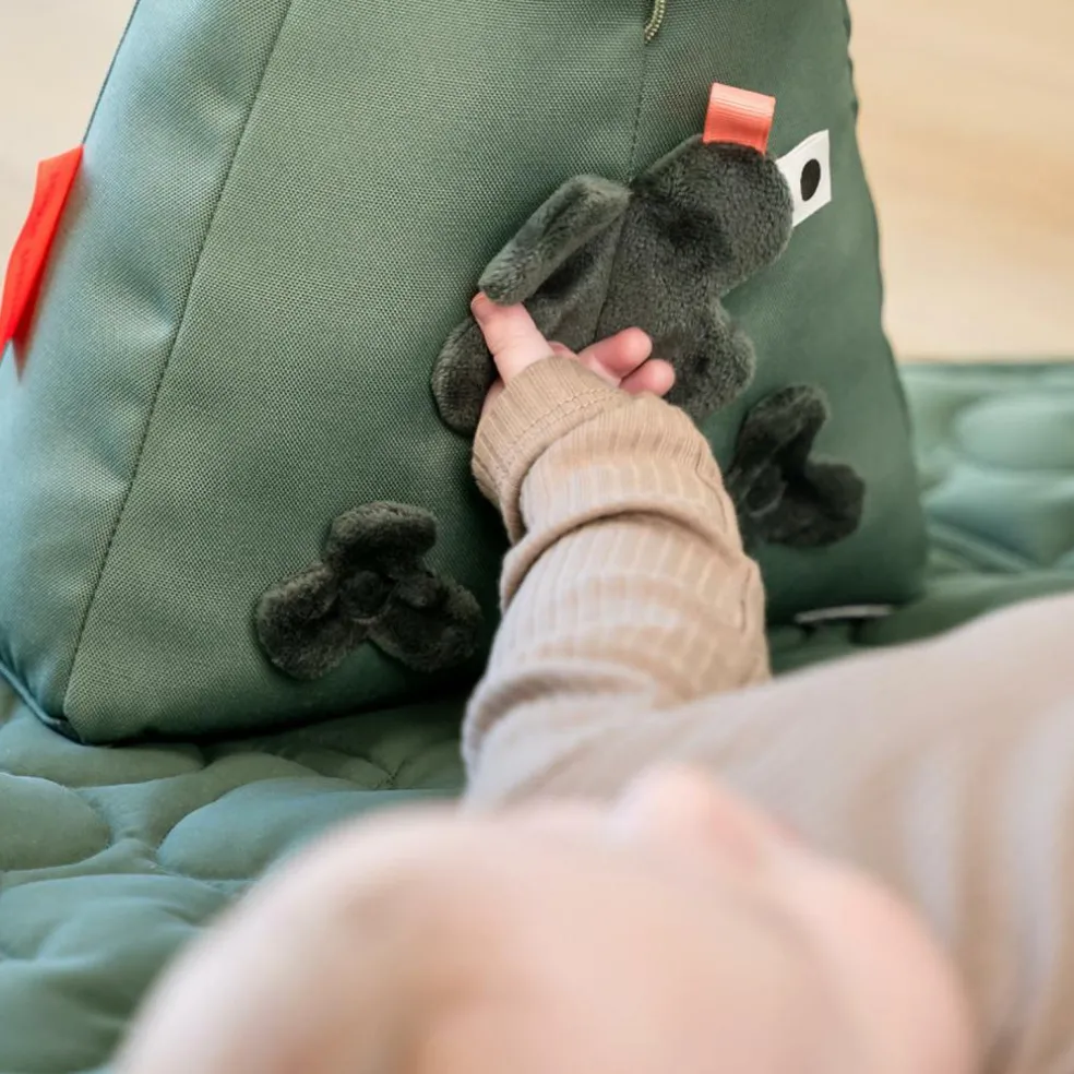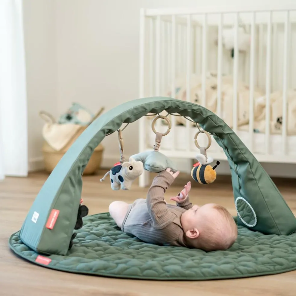 Éveillez la curiosité et la motricité de votre bébé avec l’arche d’activités Tiny Farm vert, un espace de jeu sensoriel complet et élégant !