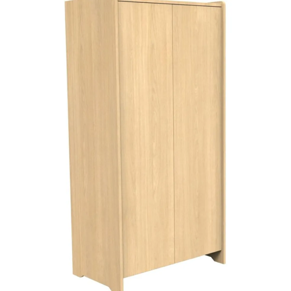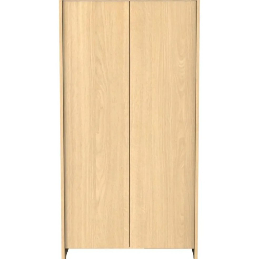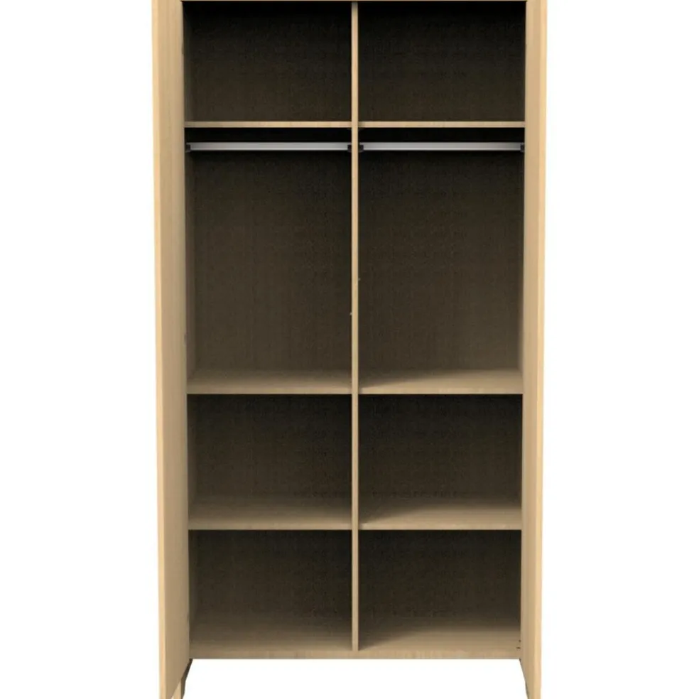 – Cotés, dessus, dessous, séparation verticale, 6 tablettes intérieures et portes en panneaux de particules mélaminés décor chêne miel, chants décor bois.