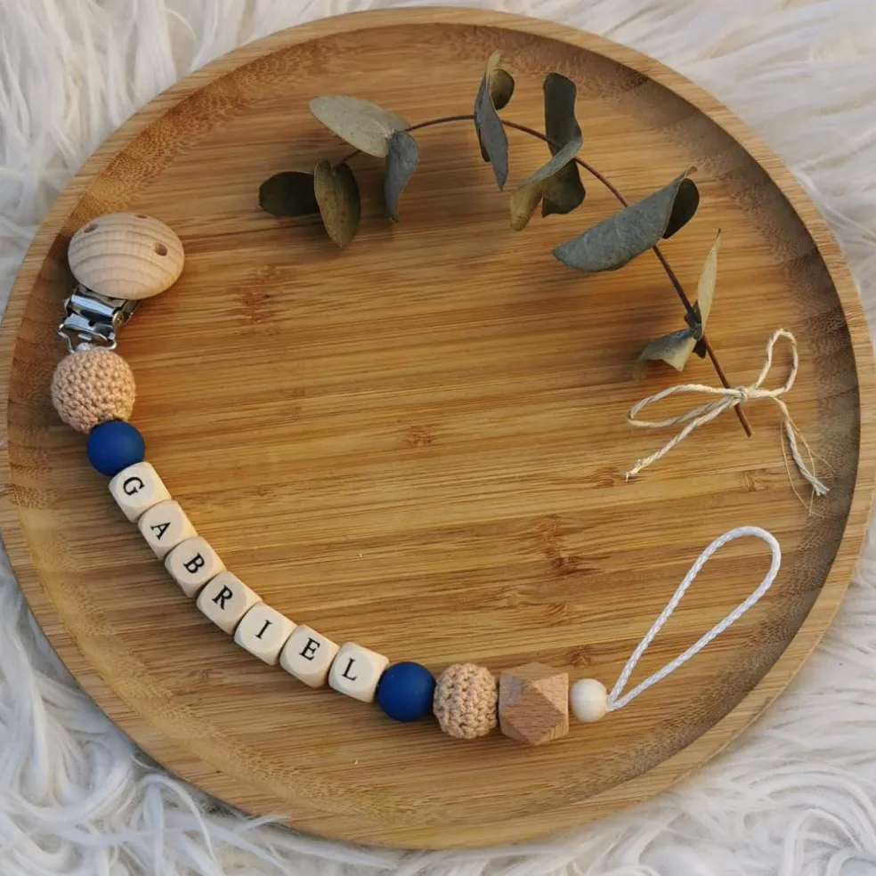 L’attache sucette en bois camel et bleu nuit de la marque Tata Lucette évitera à bébé de perdre sa sucette, pour qu’elle soit toujours là pour lui apporter du réconfort. Réalisée avec des matériaux naturels sains pour l’enfant, elle stimulera aussi son toucher grâce aux différentes matières. En plus d’être pratique, cet accessoire peut être personnalisé pour le rendre unique.