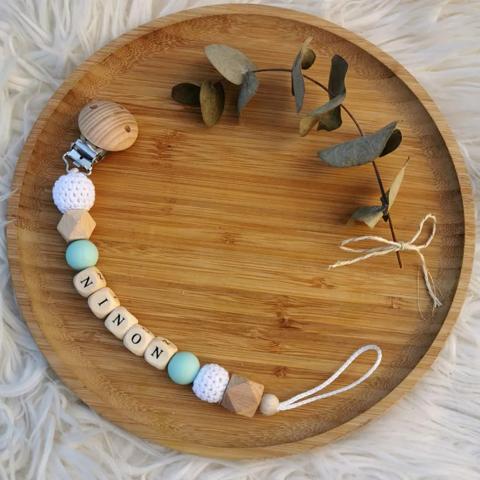 L’attache sucette en bois mint et blanc de la marque Tata Lucette évitera à bébé de perdre sa sucette, pour qu’elle soit toujours là pour lui apporter du réconfort. Réalisée avec des matériaux naturels sains pour l’enfant, elle stimulera aussi son toucher grâce aux différentes matières. En plus d’être pratique, cet accessoire peut être personnalisé pour le rendre unique.