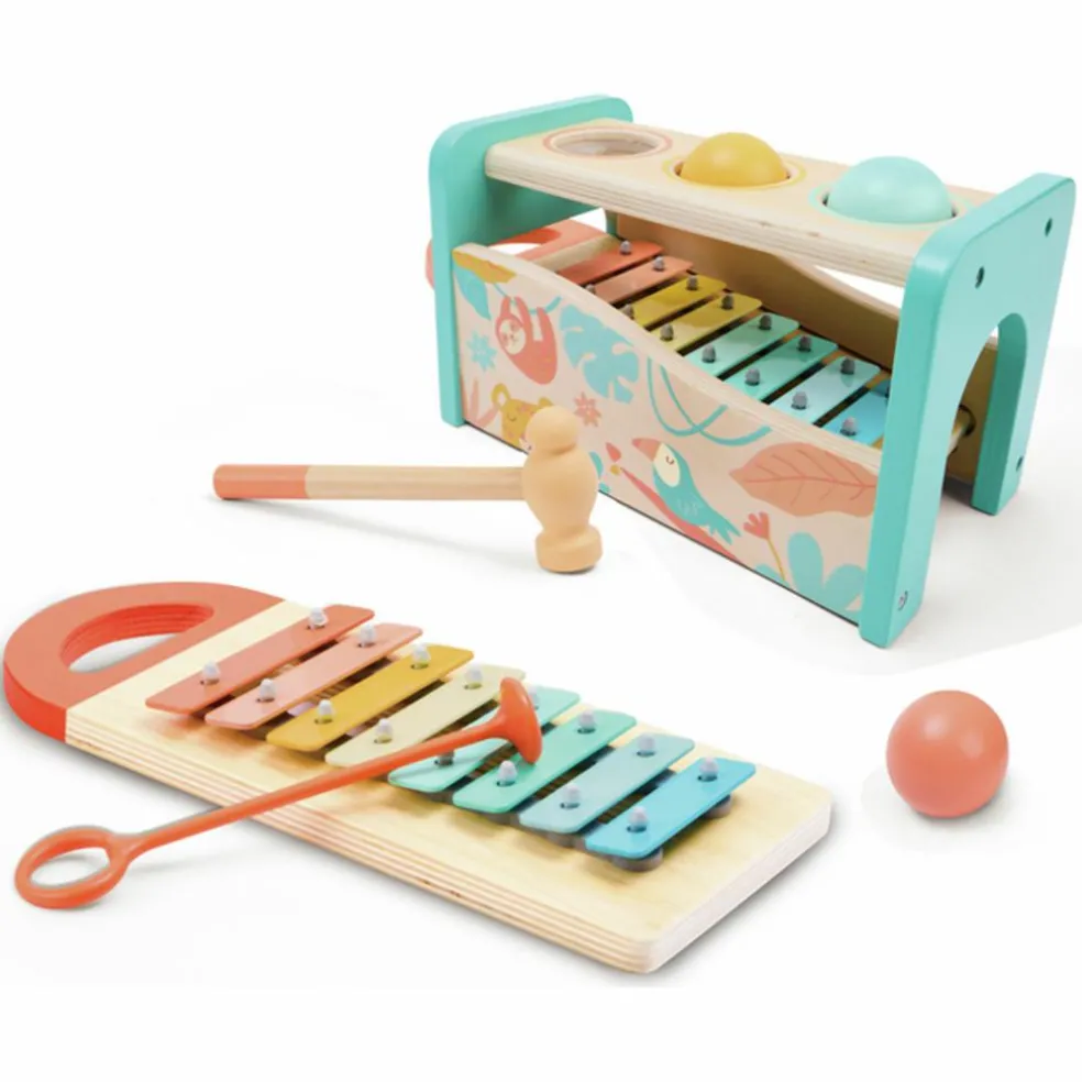 Le banc à marteler Jungle Hape est un jouet d’éveil ludique et sensoriel parfait pour stimuler la motricité fine et la coordination œil-main des tout-petits. En frappant sur les boules pastel à l’aide du marteau, bébé les fait tomber sur le xylophone intégré, déclenchant une douce mélodie qui l’enchante à chaque coup. Le xylophone peut également être utilisé séparément, pour encore plus de découvertes musicales !