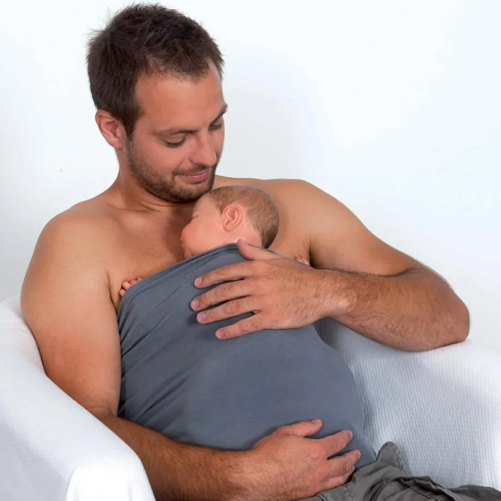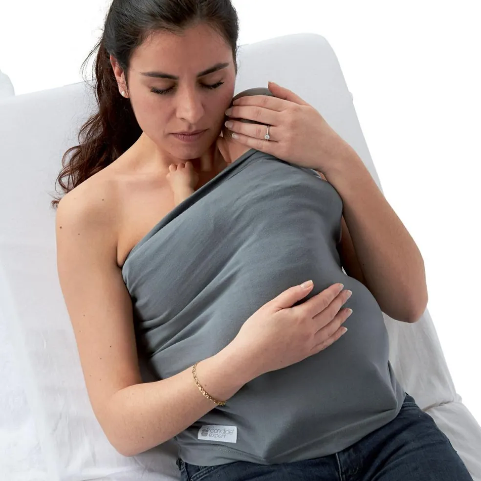 Le bandeau de peau à peau gris de la marque Candide permet de porter bébé à même la peau pour lui offrir les mêmes sensations rassurantes que dans le ventre de sa maman.