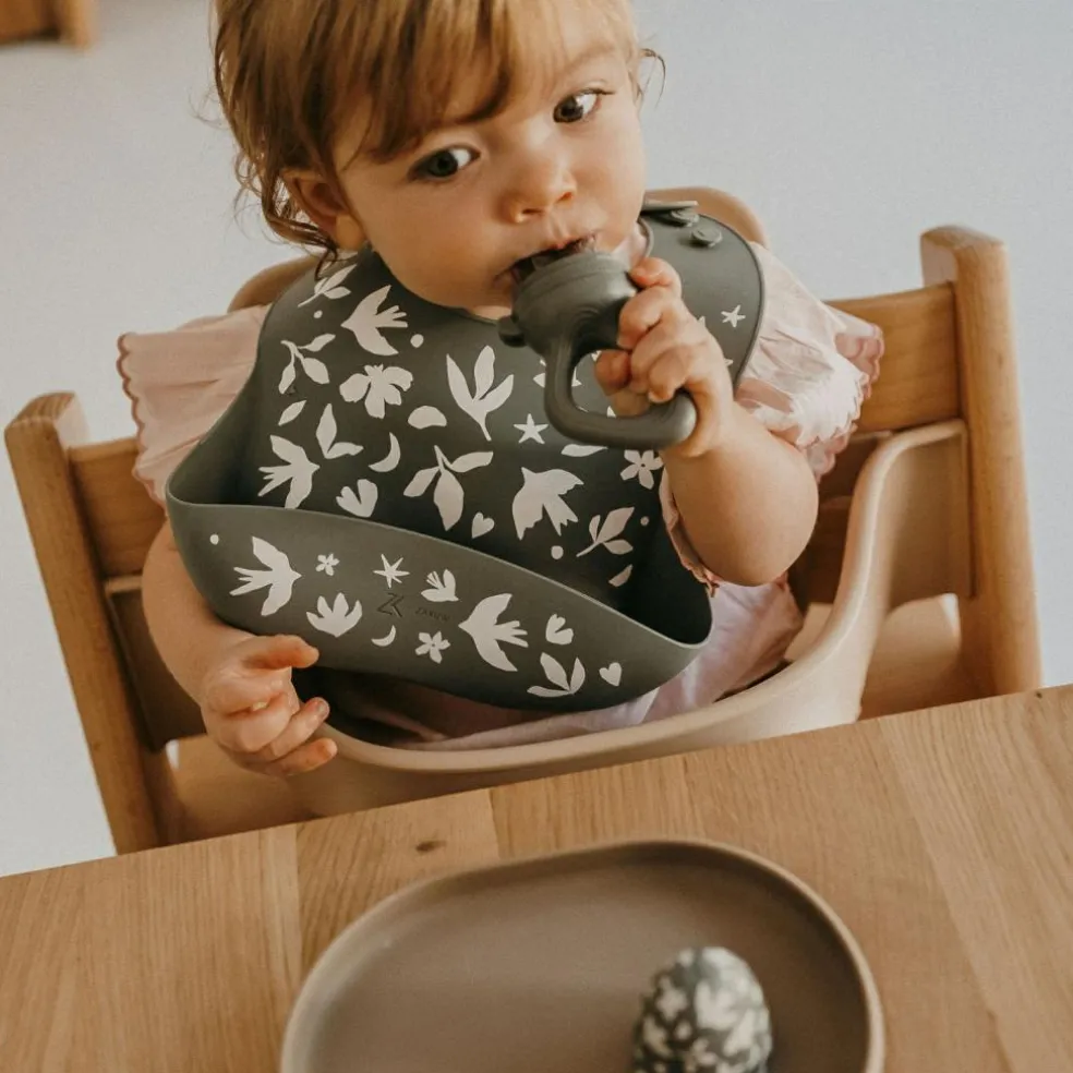 Et pour un look coordonné irrésistible, craquez aussi pour la tétine grignoteuse “Birdy”, assortie au bavoir.