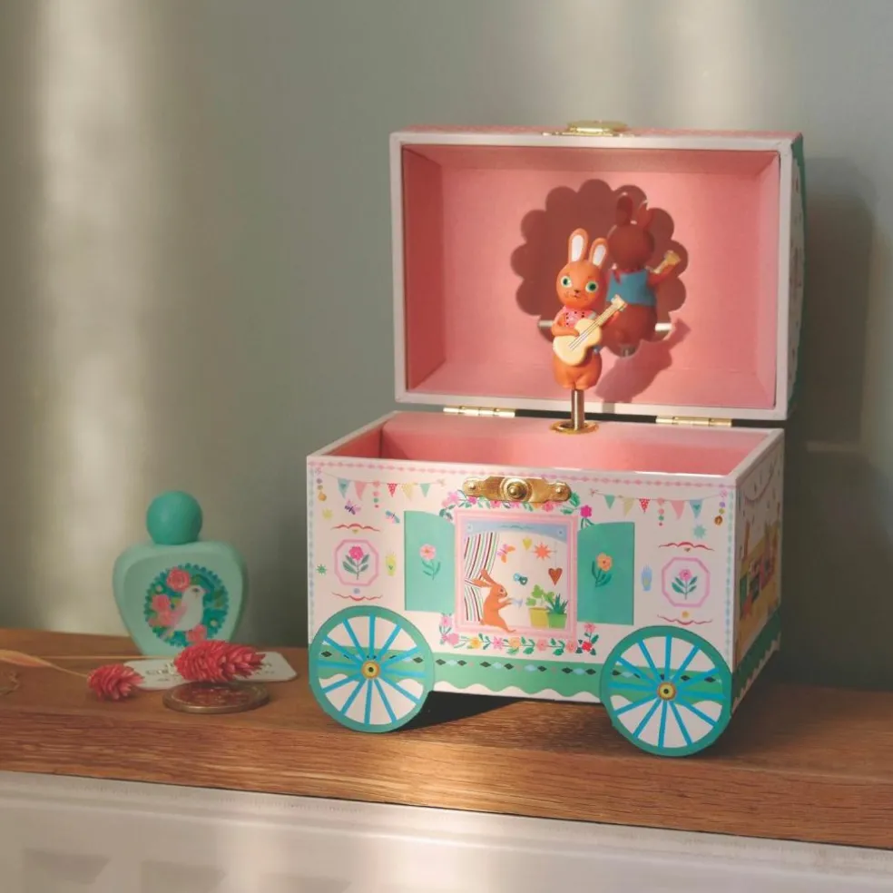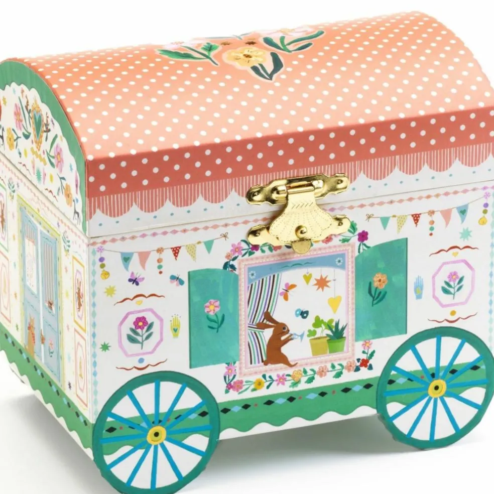 – Roulotte enchantée est une boîte à musique en forme de roulotte joliment illustrée pour ranger ses bijoux et secrets.
