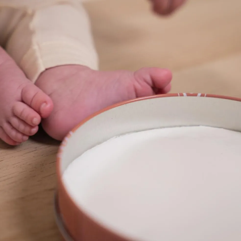 – La Baby box comprend une boîte métal ronde, un sachet de pâte hypoallergénique, un support, un rouleau en bois ainsi qu’un descriptif pour créer facilement l’empreinte.
