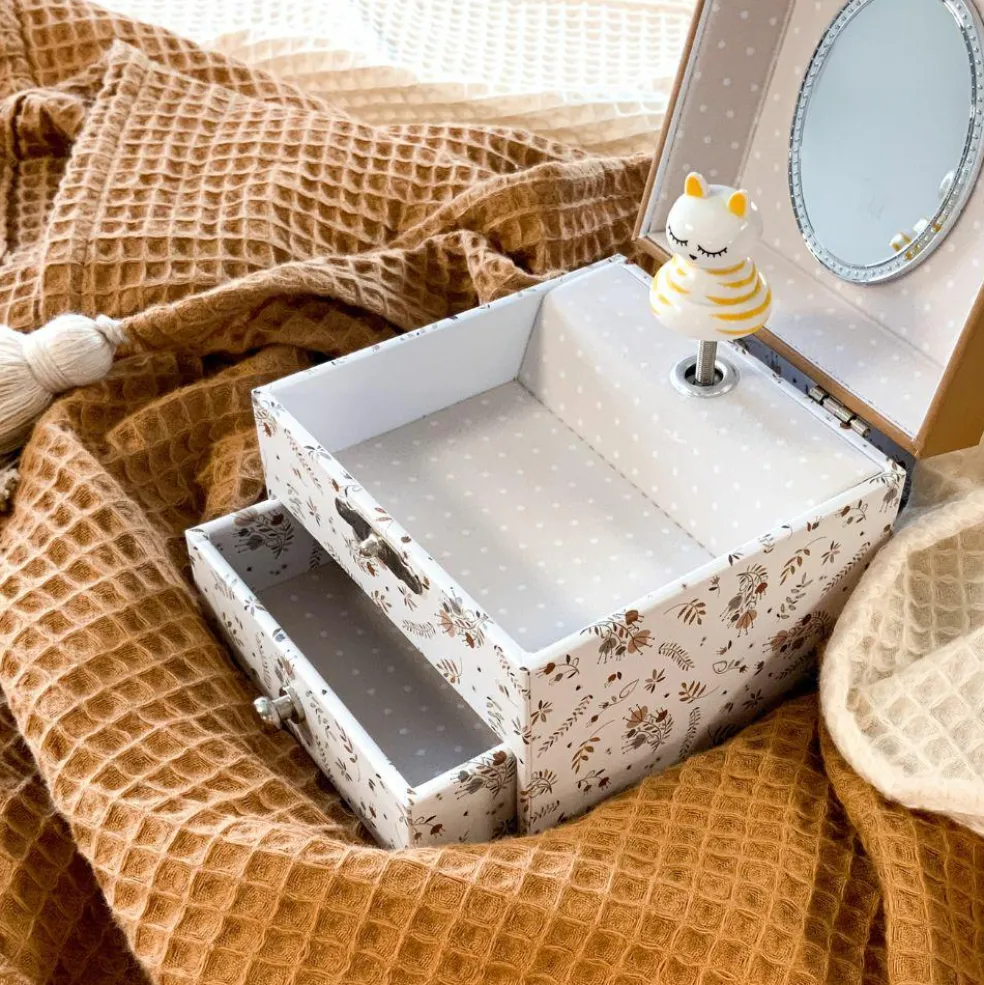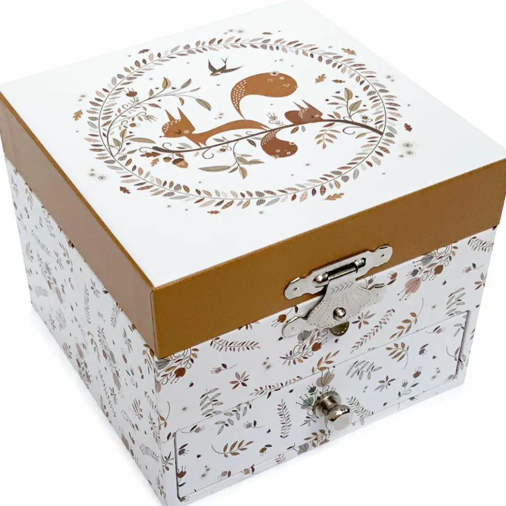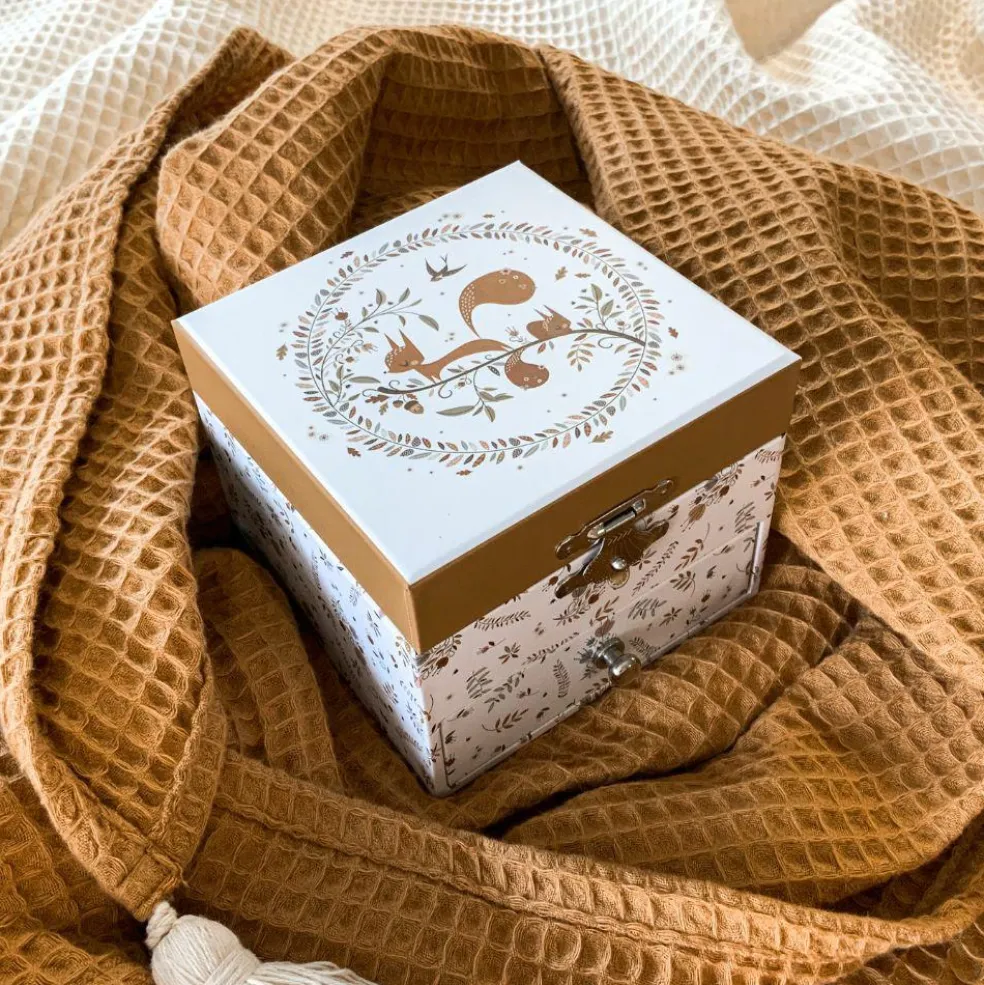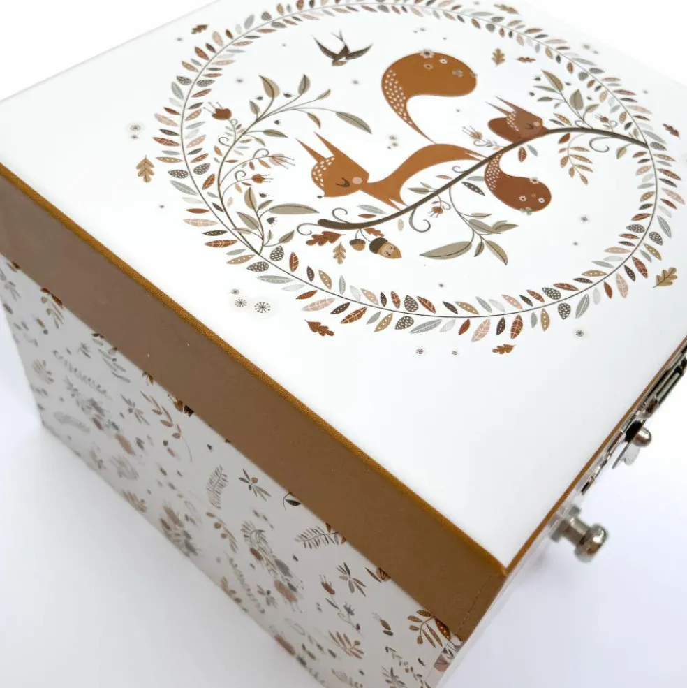 La boîte à musique cube écureuil dans la prairie Lutin Petit Pois de la marque Trousselier permet aux enfants de ranger leurs trésors tout en apportant une jolie touche déco à leur chambre. En actionnant la manivelle, la figurine s’anime comme par magie au son de la musique !