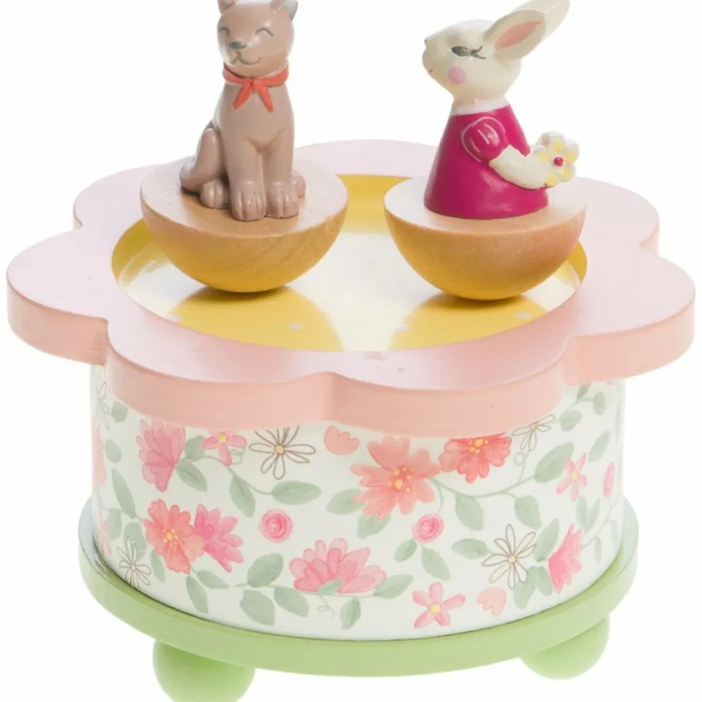– Un univers enchanteur : le lapin et le chat tournent au son d’une douce mélodie, captivant les enfants.