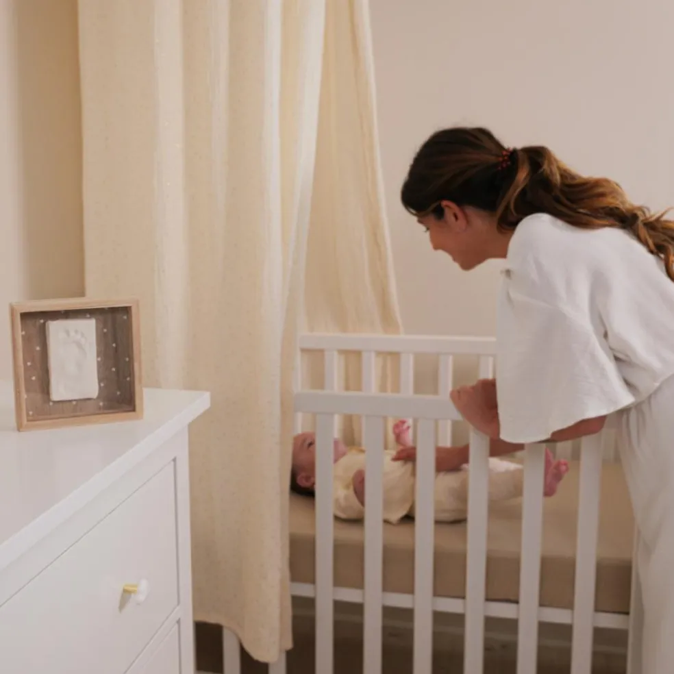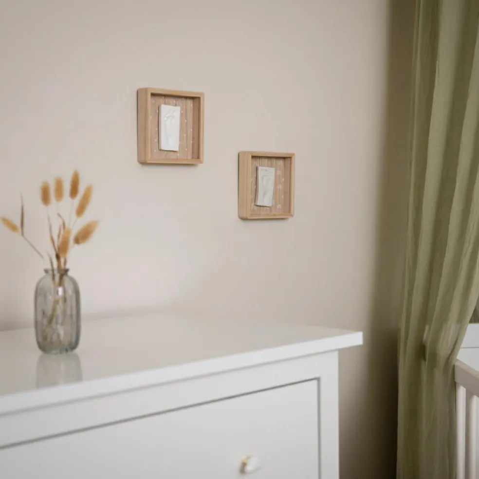 – Il comprend un cadre en bois avec couvercle de protection, un sachet de pâte hypoallergénique, un rouleau et un descriptif pour créer facilement l’empreinte.