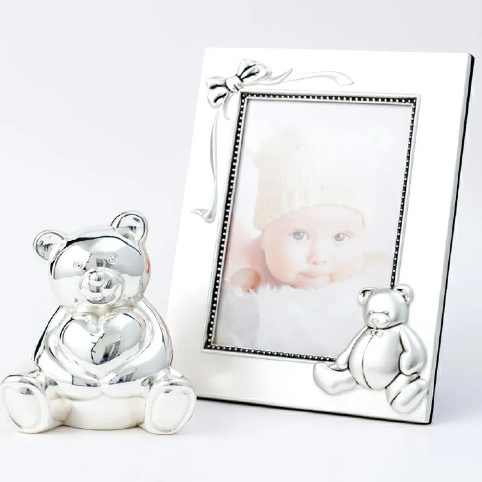 Un trés beau cadre photo de l’Orfévrerie de Crévigny orné d’un petit ours et d’un petit noeud dans chaque angle.