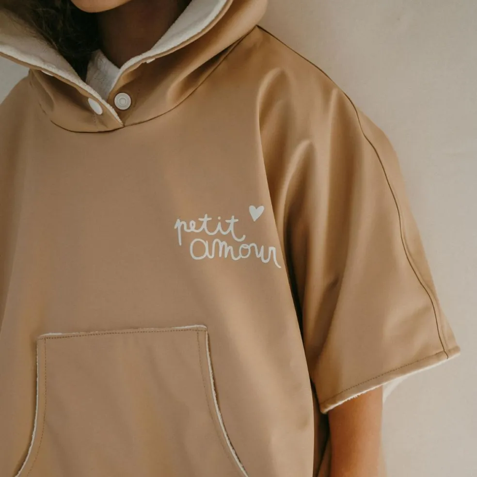 La poche ventrale pratique permet de garder les petites mains au sec ou d’y glisser un mouchoir, et l’inscription délicate « Petit Amour » ajoute une touche de tendresse irrésistible. Une cape fonctionnelle, confortable et pleine de charme qui deviendra vite un incontournable du vestiaire de votre enfant.