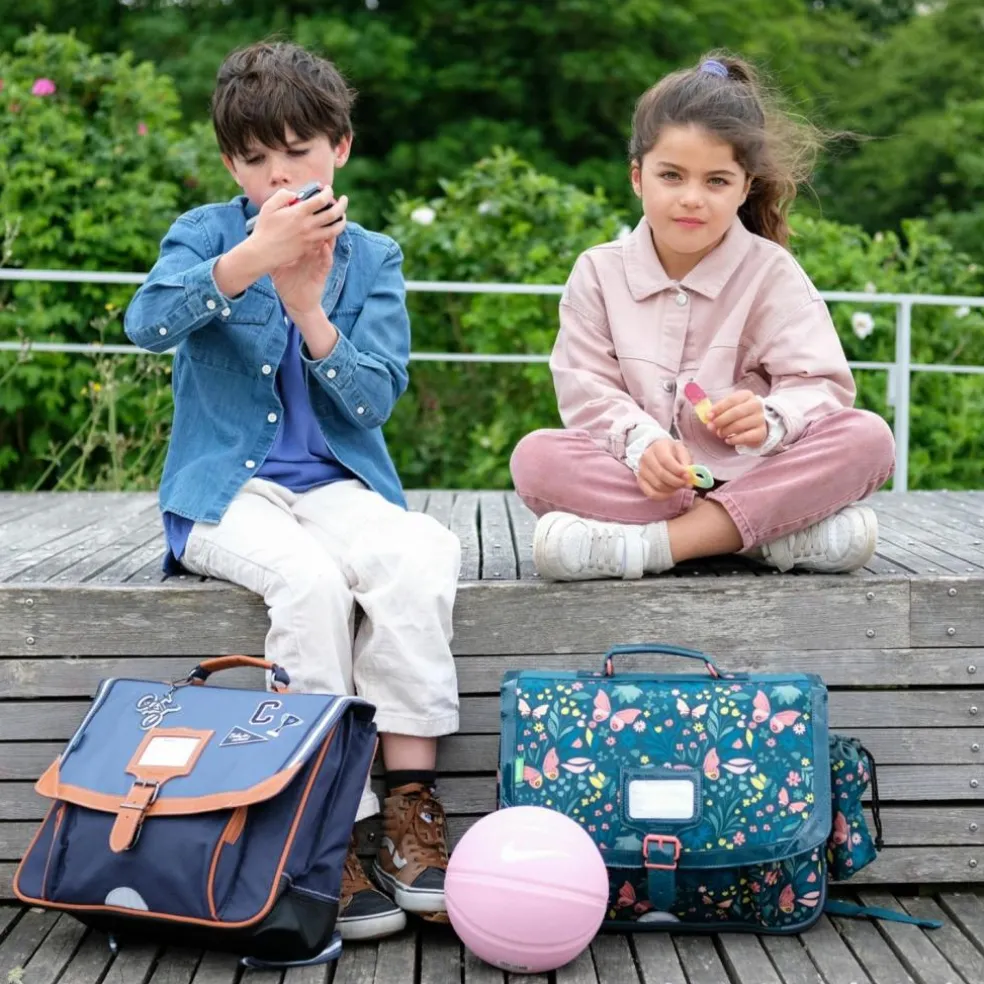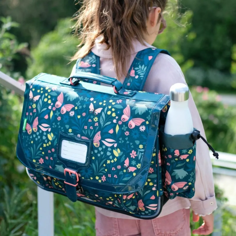Papillons et lucioles dansent la farandole au milieu des fleurs. D’un beau vert profond, associé à des notes roses et jaunes, le cartable Romane nous transporte dans une forêt féérique, pour une année tout en magie. La ganse vernis apporte une touche chic et élégante.