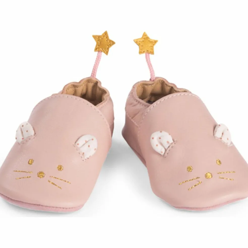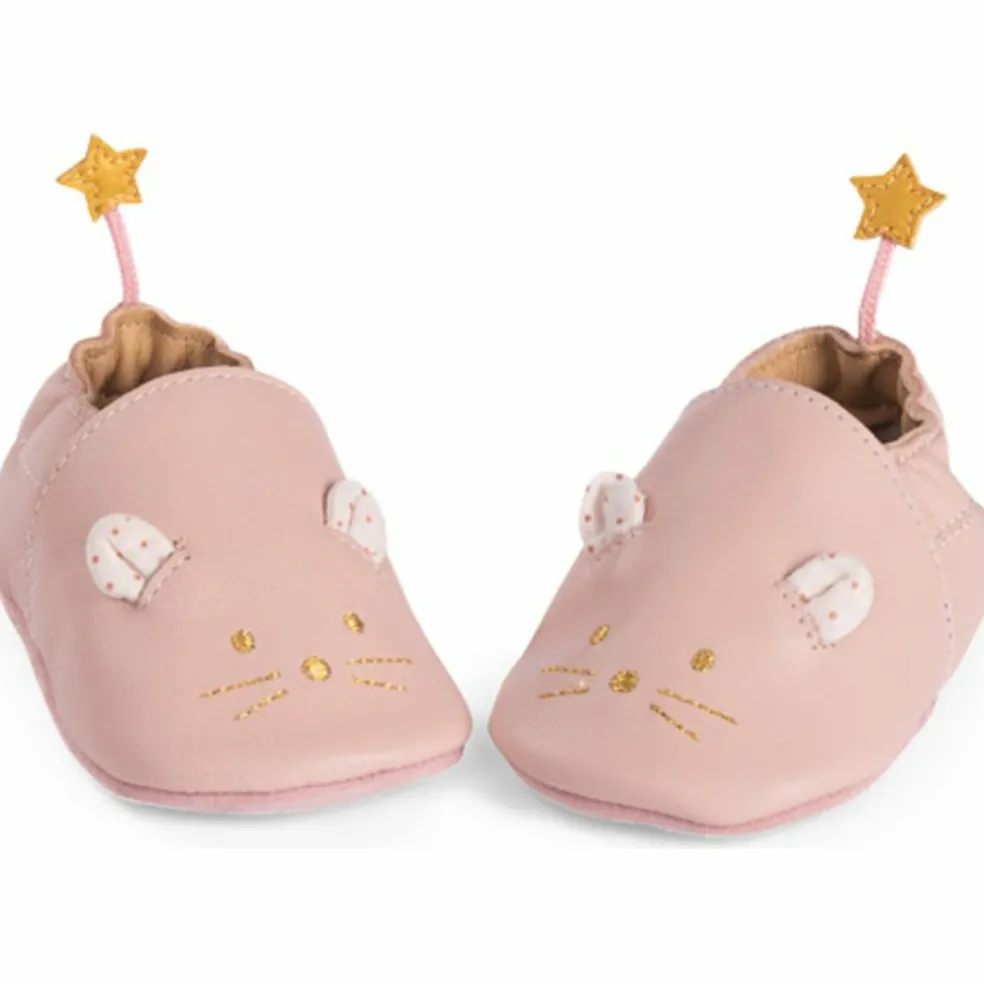 – Chaussons en cuir 0/6m avec fermeture élastiquée, brodés d’une souris dorée avec ses oreilles à pois.