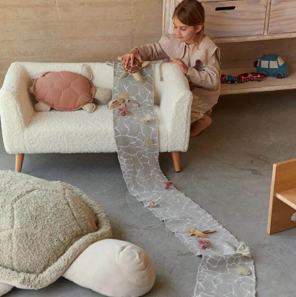 – Tortue enroulée dans un rouleau de toile de 4 mètres de long, de couleur bleu sauge, sur lequel est imprimé le monde magique du fond de la mer avec ses coraux multicolores et les reflets de l’eau.