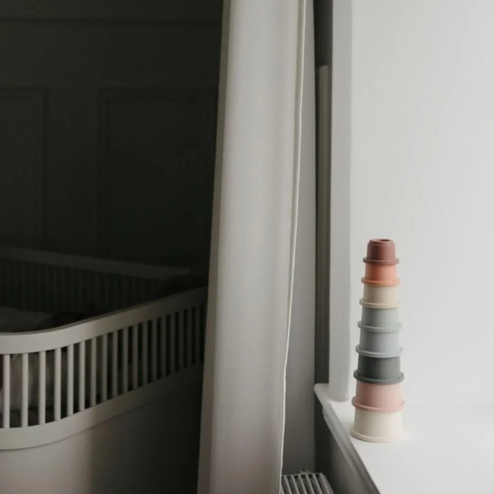 – Tasses à empiler Mushie : Empiler, renverser, recommencer… un jeu captivant qui stimule l’agilité et la concentration.