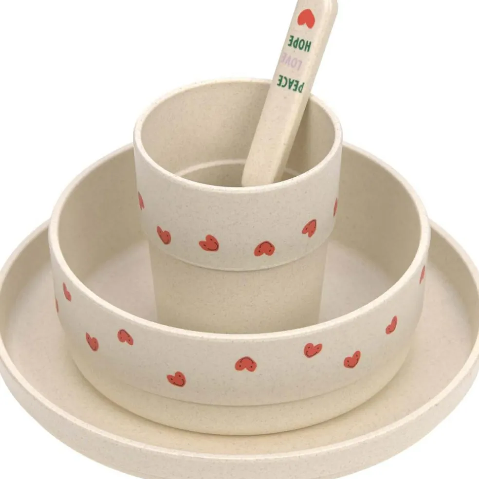 – Comprend une assiette, un bol, un gobelet et une cuillère.