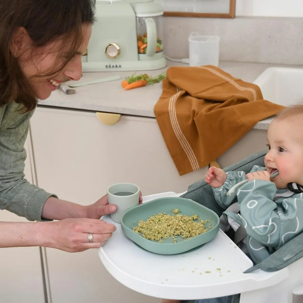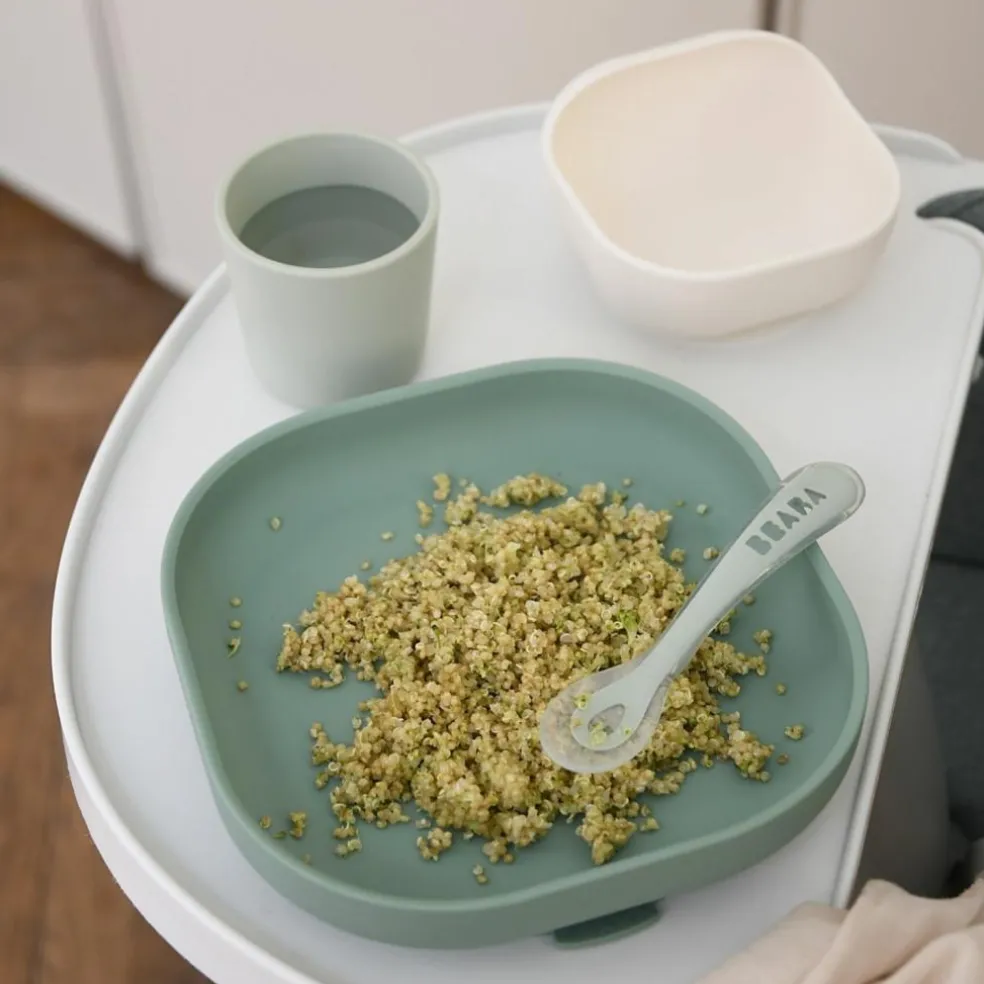 Faites de chaque repas un moment serein et joyeux avec le Coffret repas silicone vert sauge et vert de gris (4 pièces).
