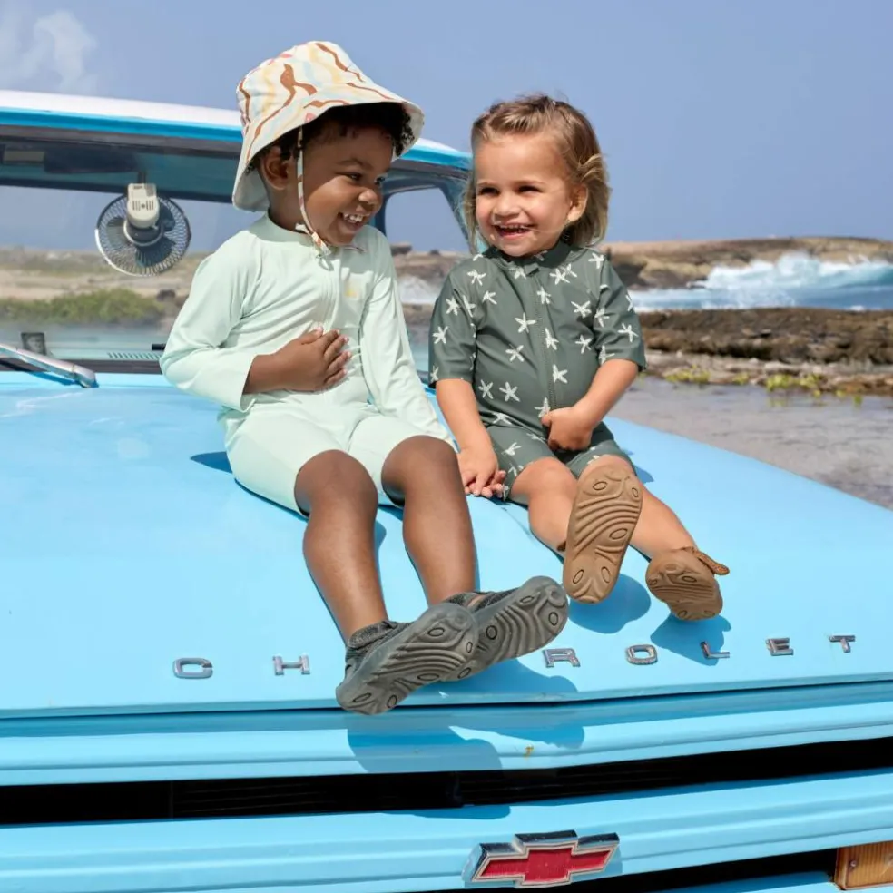 – Protection contre les rayons UV à terre ou dans l’eau en association avec la crème solaire et le chapeau anti-UV assorti.