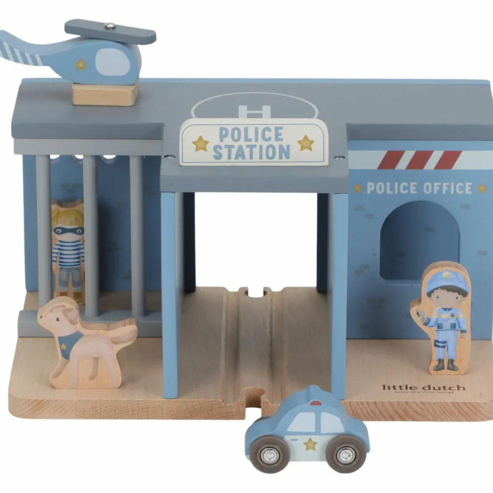 – Poste de police en bois avec cellule à barreaux. – Contient : 1 voiture de police, 1 hélicoptère, 1 officier, 1 voleur et 1 chien policier. – Avec plateforme d’atterrissage. – Matériau : bois solide et écologique. – Compatible avec d’autres jouets en bois.