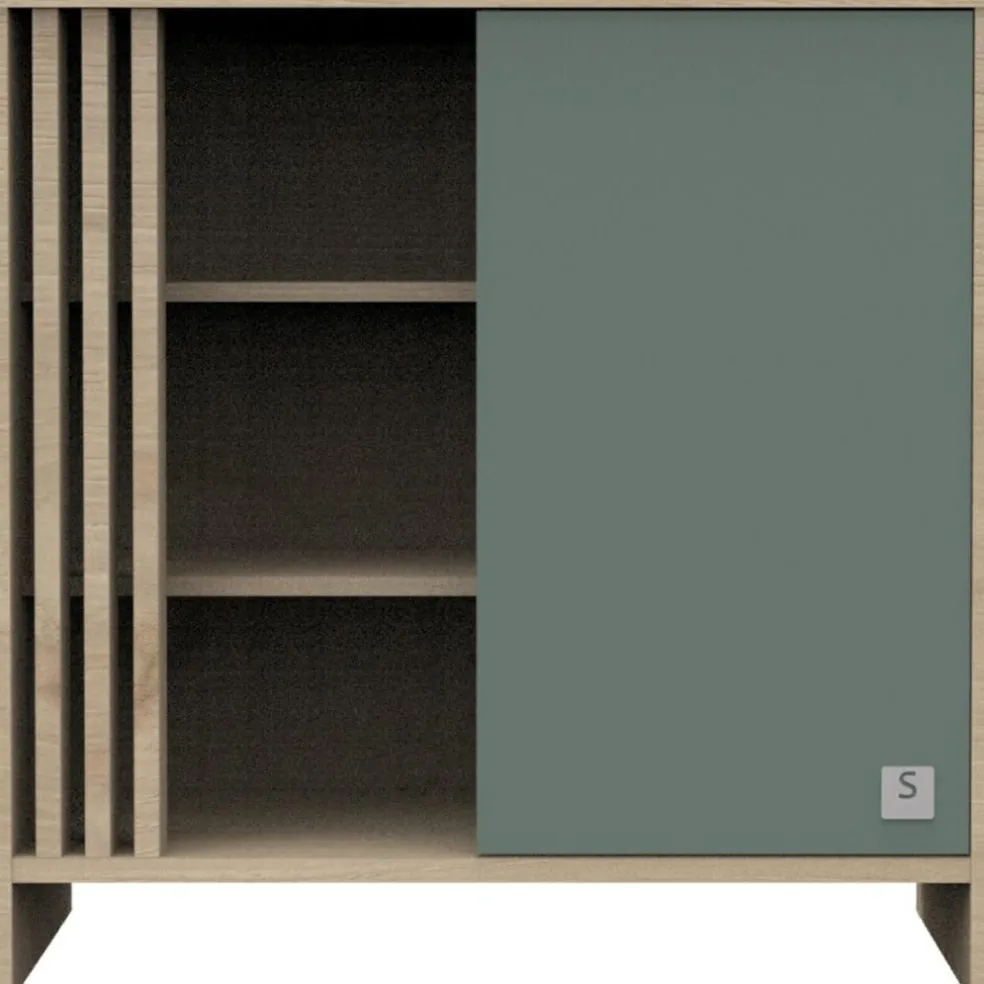 – Côtés, dessus, dessous, séparation verticale, 4 tablettes et 3 montants décors en panneaux de particules revêtus papier décor chêne suave, chants décor bois.