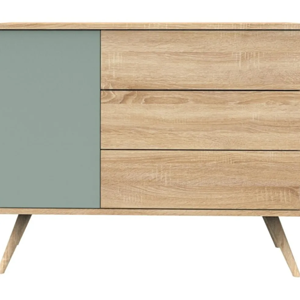 – 2 cotés, séparation verticale, 1 tablette intérieure, dessus, dessous et 3 faces tiroirs en panneaux de particules mélaminés décor chêne doré, chants décor bois.