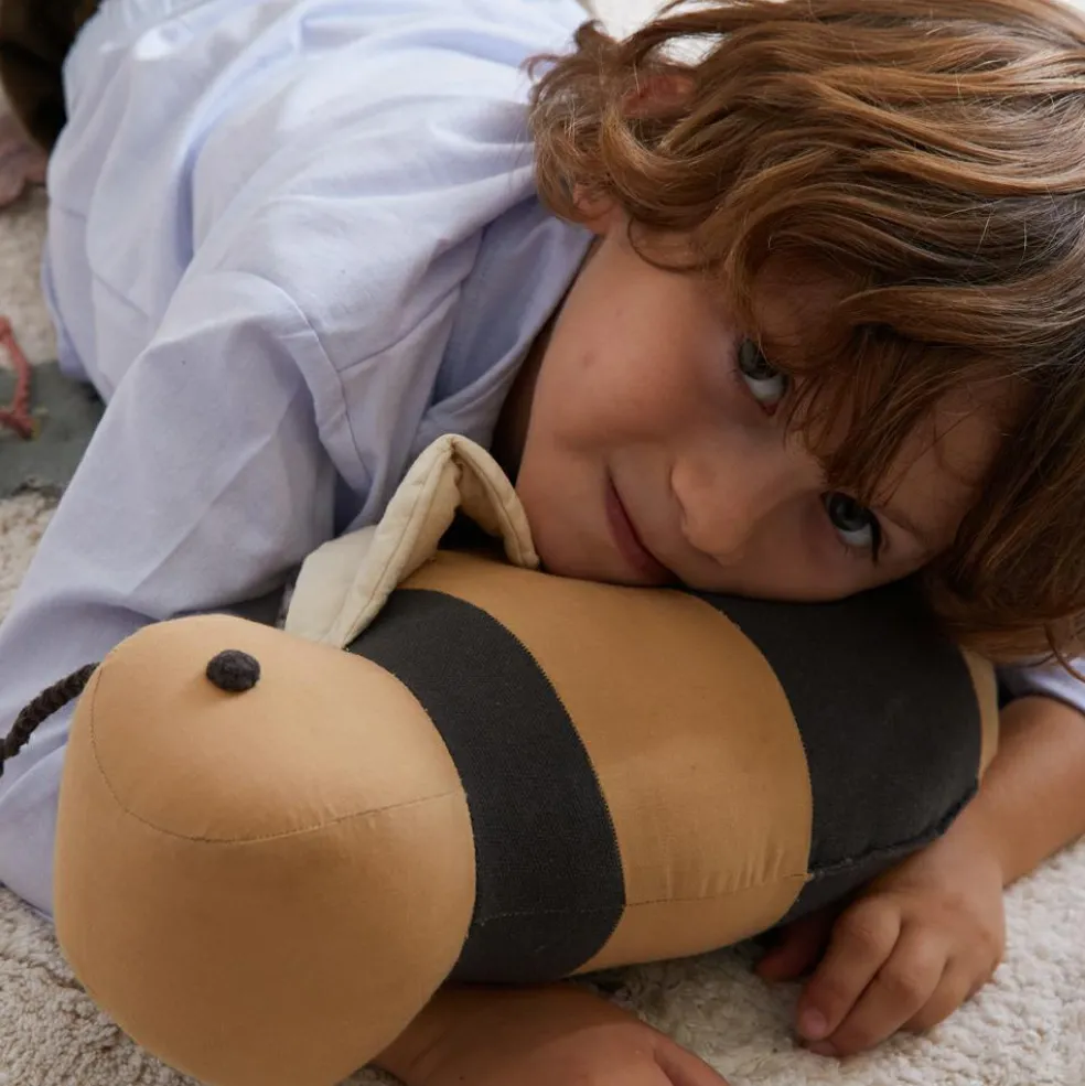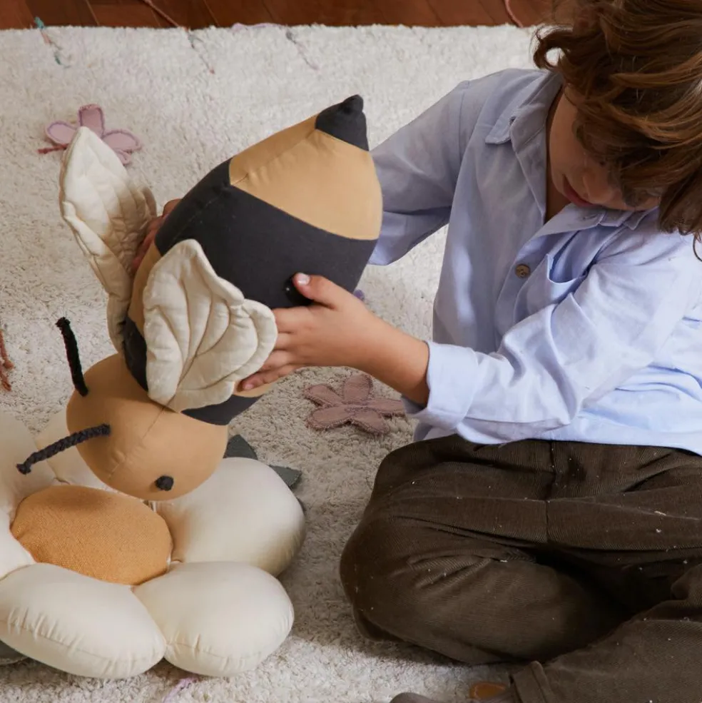 – Le coussin confortable Buzzy Bee est fabriqué en popeline de coton douce de couleur miel avec des taches de rayures gris foncé et des ailes légèrement rembourrées de couleur naturelle.