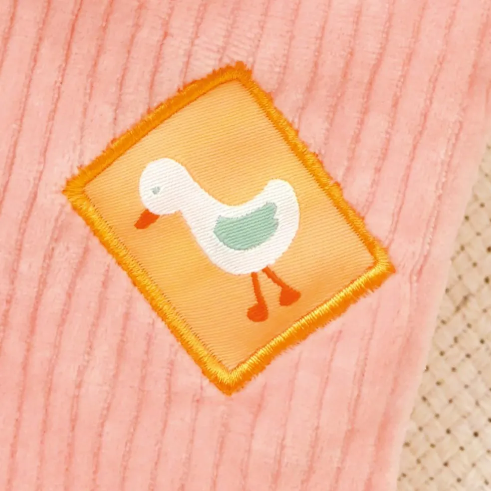 – Ses petits pieds sont rembourrés et de petites nouettes en lange sont à manipuler pour développer la motricité fine des tout-petits.
