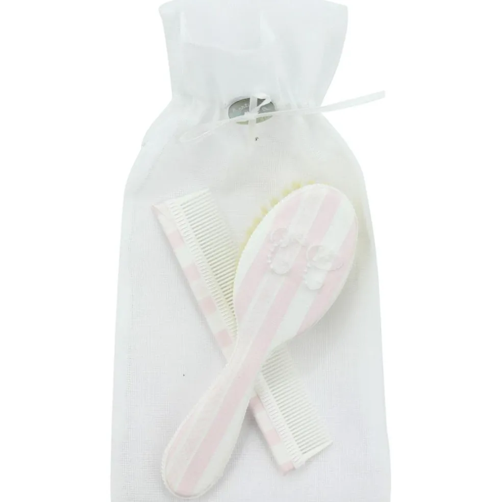 – Brosse recouverte de tissu rayé blanc et rose avec le monogramme Tartine et Chocolat.