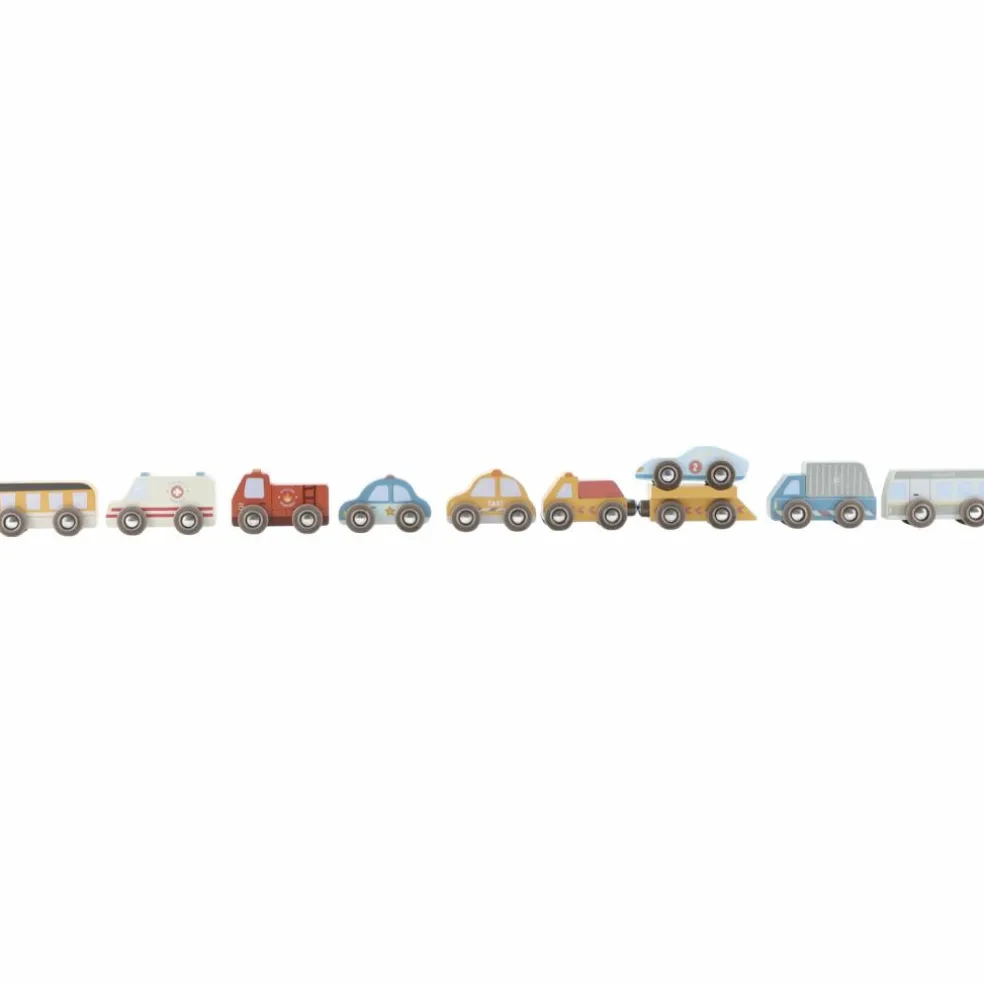 – Contenu : 9 véhicules (taxi, bus, ambulance, camion de pompier, voiture de police, camion de livraison, dépanneuse, voiture de course, etc.).