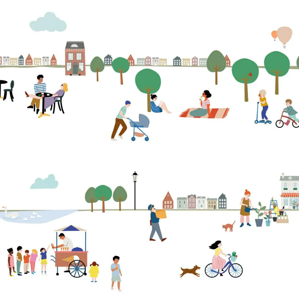– Le facteur vient livrer un colis, le vendeur de glaces fait des heureux, Papa se balade avec le bébé, et Madame s’amuse avec son chien… tant de petites scènes à découvrir.