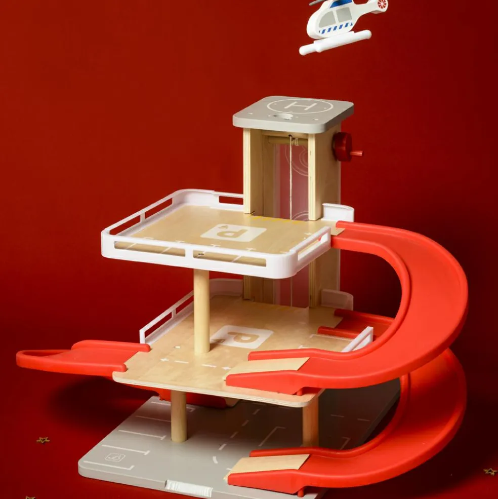 Ce garage lumineux de trois niveaux offre des possibilités d’histoires infinies à votre enfant ! A chaque étage, il trouve des places de parking pour garer ou faire circuler ses voitures. D’ailleurs, deux voitures en métal sont incluses pour qu’il commence à les faire rouler sans plus attendre. Pressé par le temps ou juste envie d’offrir des sensations fortes à ses voitures ? Il utilise le grand ascenseur mécanique qui passe par tous les niveaux. Le dos de l’ascenseur est transparent avec les numéros des étages, idéal pour savoir quand s’arrêter ! Envie de changement ? Au sommet de ce grand garage, un hélicoptère permet de quitter la terre pour s’aventurer dans le ciel. D’ailleurs, quand la nuit tombe, votre enfant peut éclairer son garage pour continuer à s’inventer de nombreuses histoires.