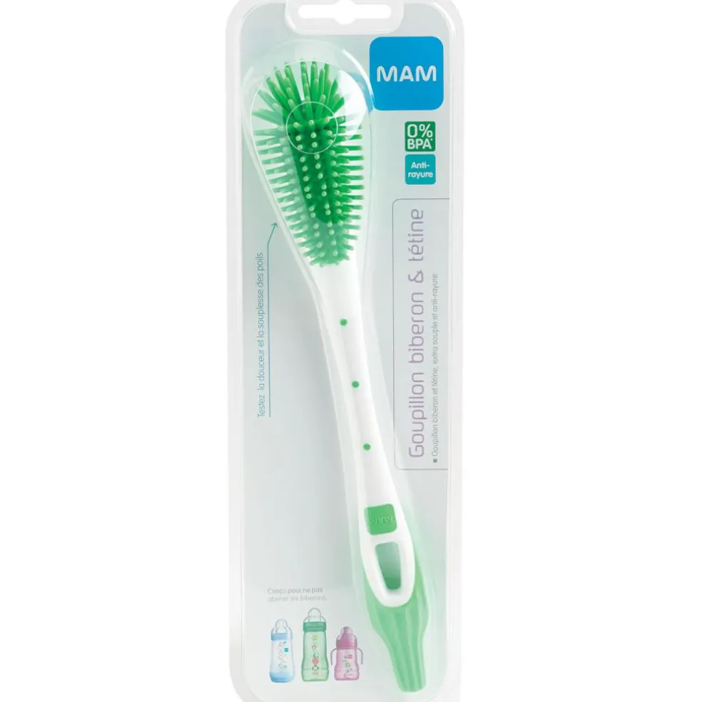 Le goupillon biberon et tétine de la marque MAM lave le biberon et la tétine, même dans les endroits les plus difficiles. Souple et anti-rayure, son orifice de suspension vous permettra de le ranger facilement.