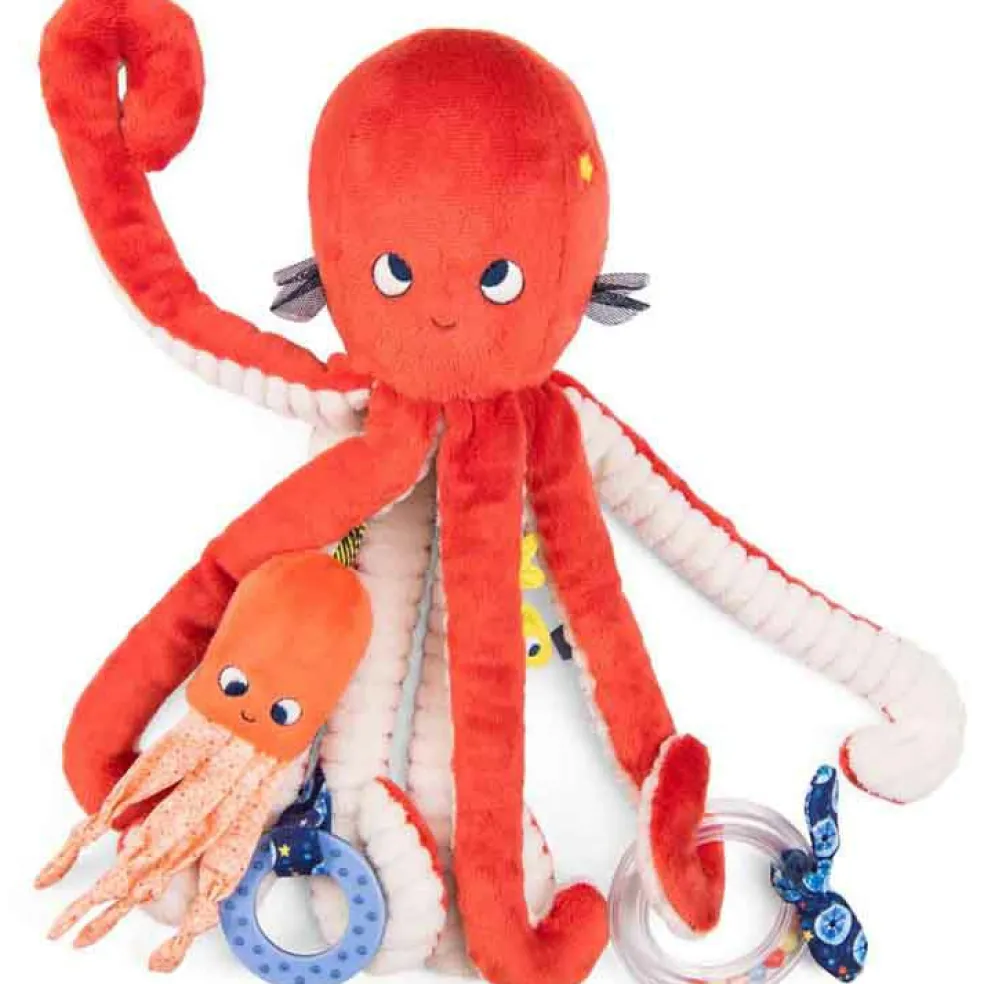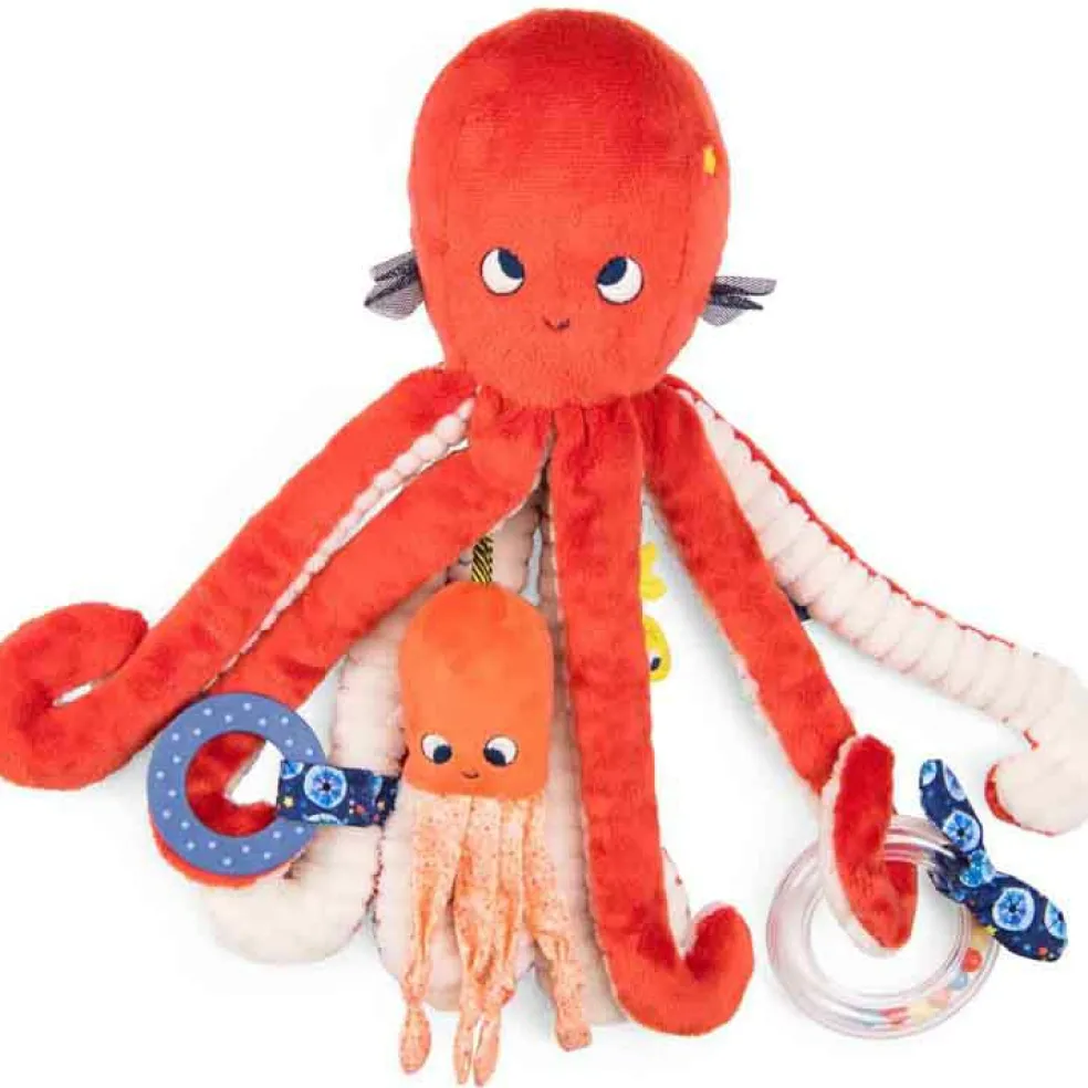 – Nombreuses activités : grelot, anneau à billes colorées, étiquettes et nouette à saisir, anneau de dentition et même un petit compagnon hochet, niché au creux de ses bras.