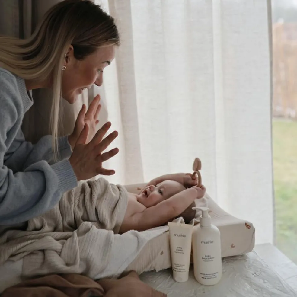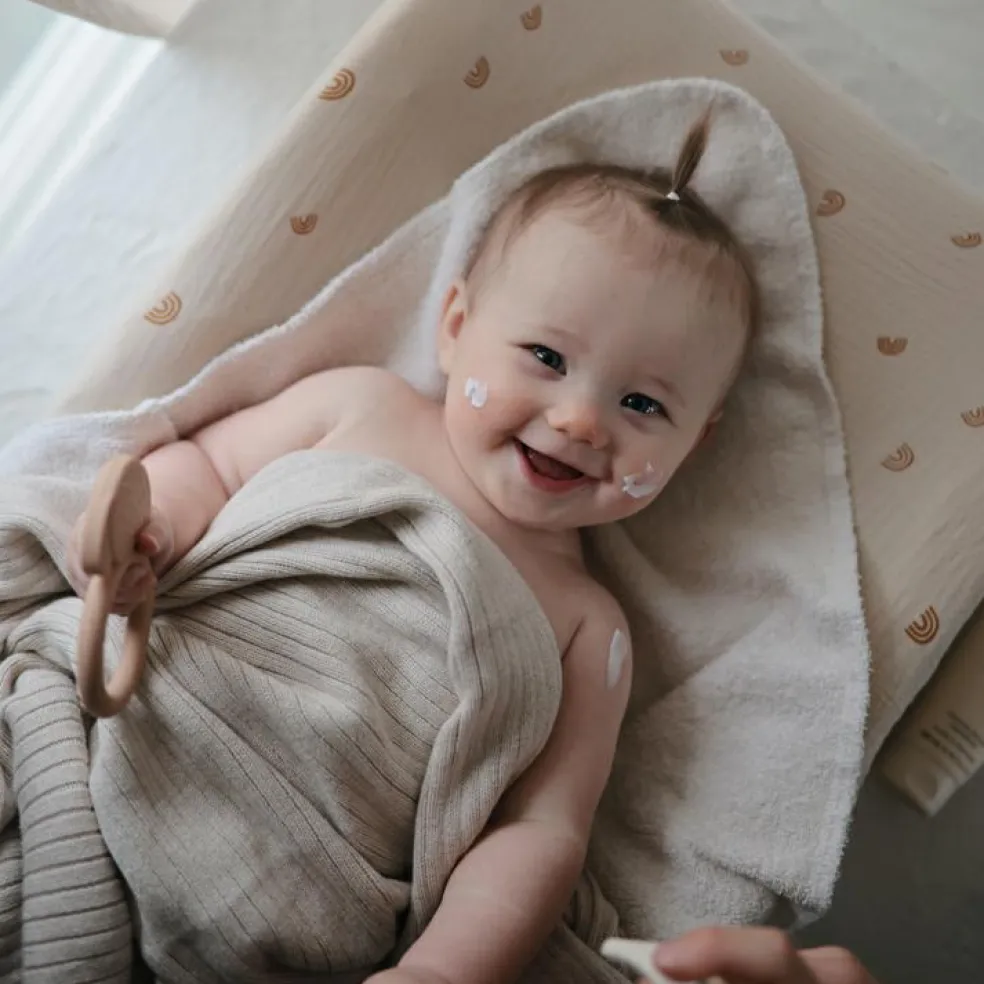 – En mousseline de coton bio prélavée.