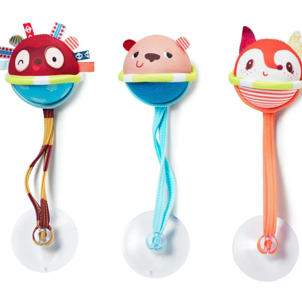 Le jouet à ventouse balles de la marque Lilliputiens ce sont 3 balles de bain qui se fixent avec des ventouses sur la paroi du bain et dansent sur l’eau, sous les yeux de bébé. Vous retrouverez sur chacune des balles Georges le lémurien, Alice la renarde et le petit ours.