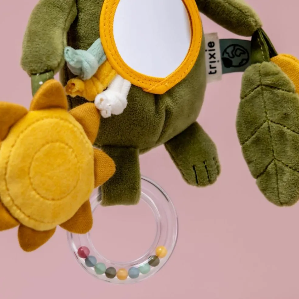 Toujours prêt à amuser bébé, Mr. Dino se fixe facilement à une poussette, un siège-auto ou un parc. Avec son anneau hochet rempli de billes colorées, son miroir cache-cache, son papier froissé et ses cordons à tirer, il offre un univers riche en découvertes. Chaque interaction stimule la vue, l’ouïe et la motricité fine de votre enfant, tout en éveillant sa curiosité. Conçu dans des matériaux doux et sûrs, ce dinosaure rigolo accompagne bébé dans toutes ses explorations quotidiennes.