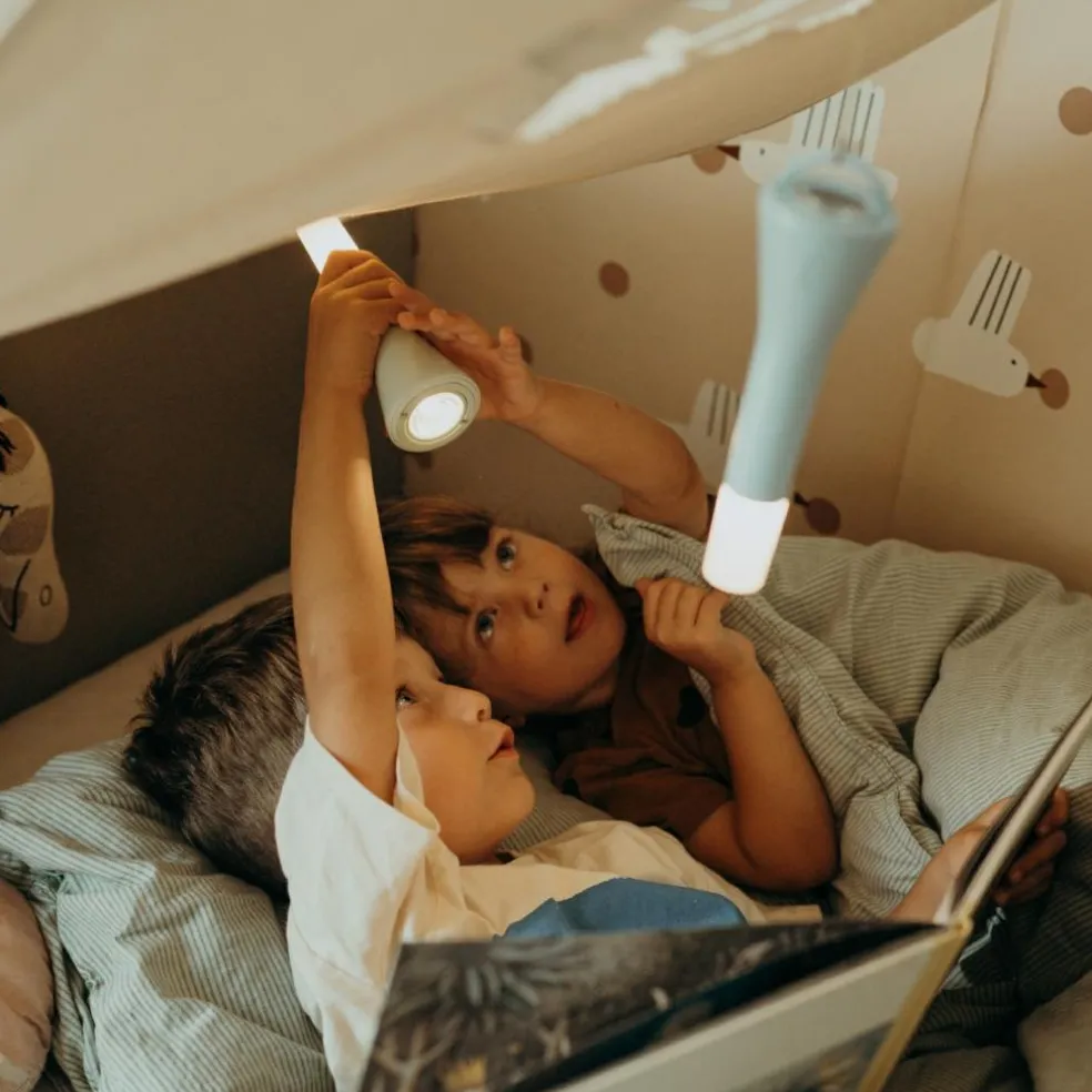 L’utilisation d’une lampe torche multifonctions comme KIDYFLASHLIGHT permet de stimuler l’imagination des enfants tout en leur offrant un sentiment de sécurité. Jouer avec la lumière et l’ombre favorise également la créativité et peut transformer le rituel du coucher en un moment amusant et rassurant. Avec ses trois fonctions, KIDYFLASHLIGHT peut être utilisée comme torche, posée pour créer une ambiance douce, ou suspendue grâce à son anneau intégré. Sa lumière chaude réglable en intensité est parfaite pour créer une atmosphère apaisante.