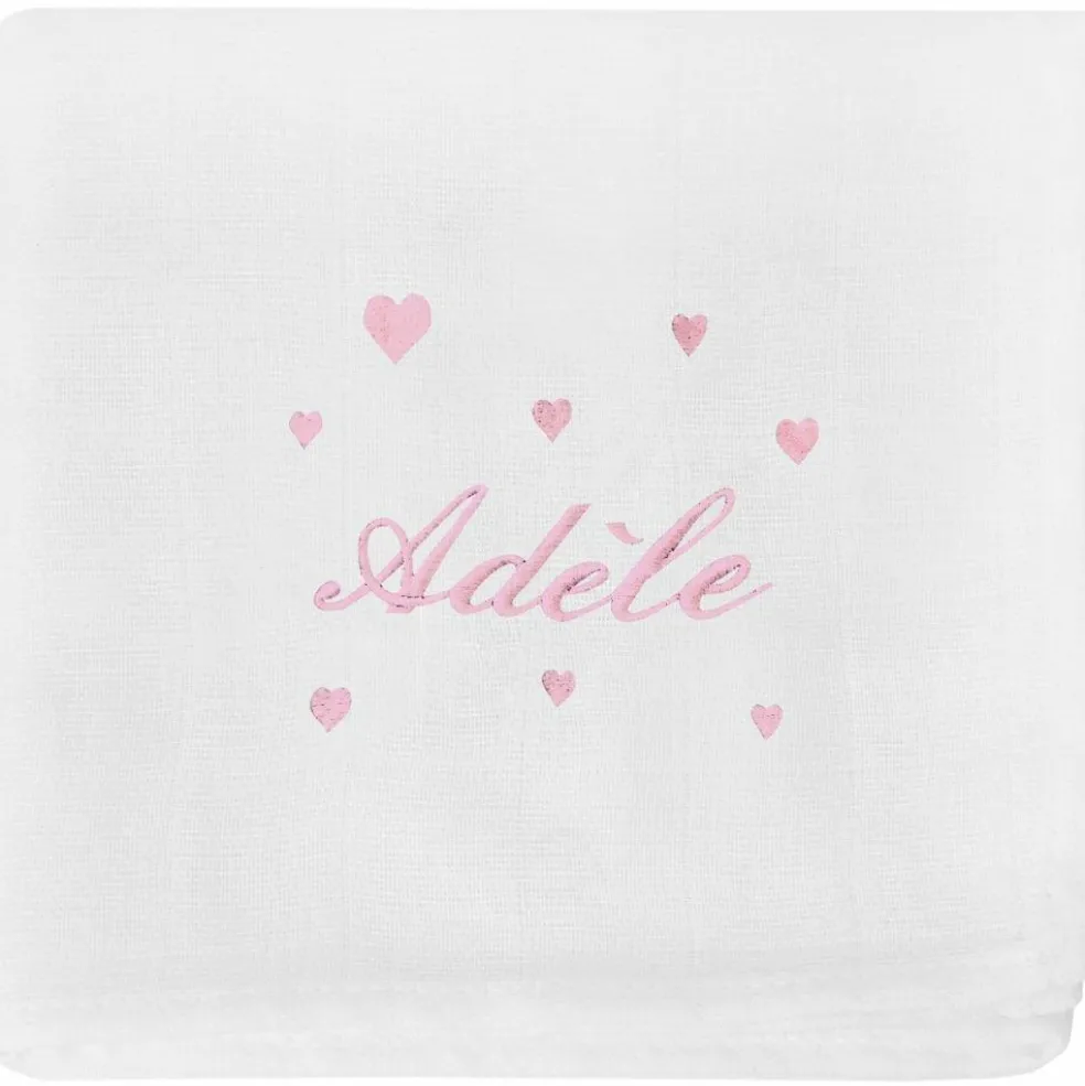– Traditionnelle couche blanche, 100% coton, brodée au prénom du bébé en rose pastel avec des coeurs.