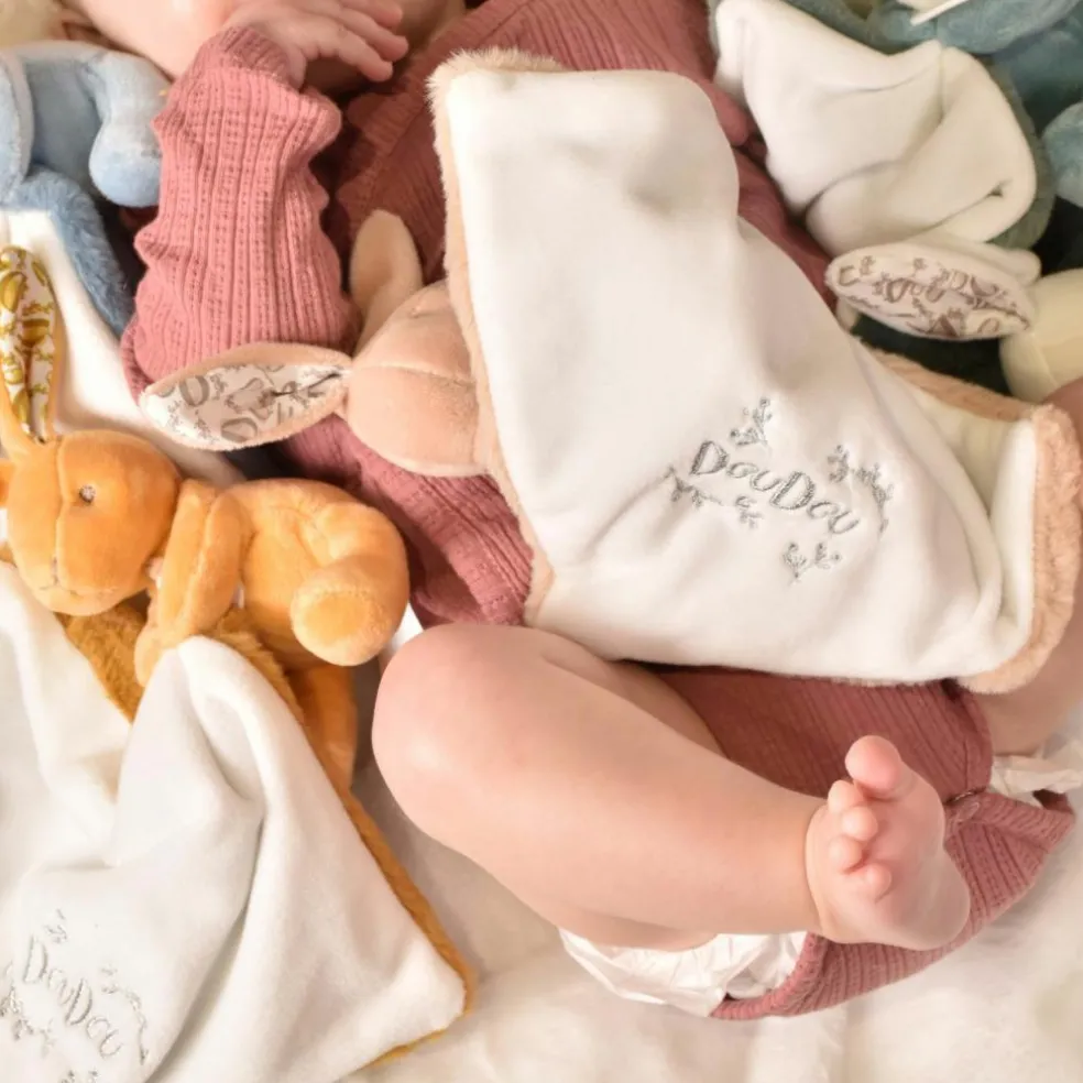 Ce petit lapin beige, au pelage d’une douceur irrésistible, serre contre lui un mouchoir plat brodé du mot « Doudou » en fil argenté. Élégant, raffiné et d’un format mini de 10 cm, il est le compagnon idéal pour apaiser et rassurer bébé dès ses premiers jours. Présenté dans une jolie boîte cadeau réutilisable, il fera une idée de naissance parfaite pour célébrer l’arrivée d’un tout-petit.