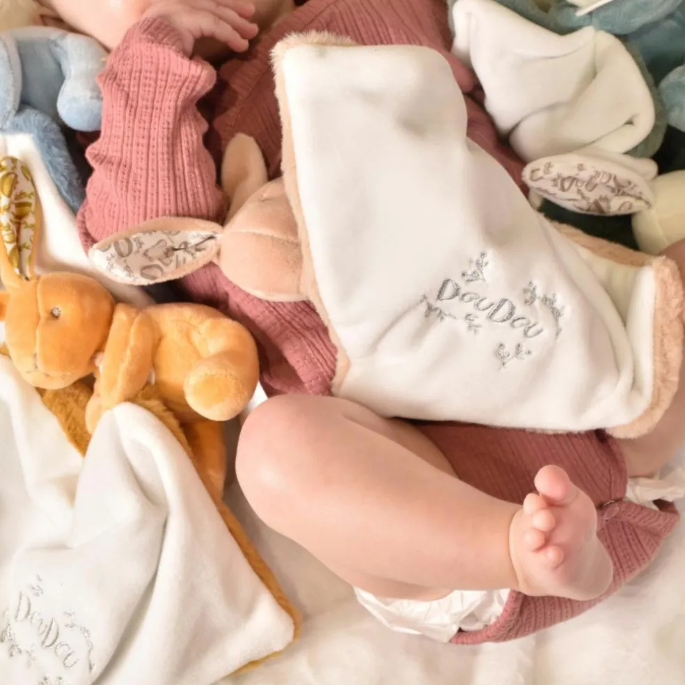 Ce petit lapin beige, au pelage d’une douceur irrésistible, serre contre lui un mouchoir plat brodé du mot « Doudou » en fil argenté. Élégant, raffiné et d’un format mini de 10 cm, il est le compagnon idéal pour apaiser et rassurer bébé dès ses premiers jours. Présenté dans une jolie boîte cadeau réutilisable, il fera une idée de naissance parfaite pour célébrer l’arrivée d’un tout-petit.