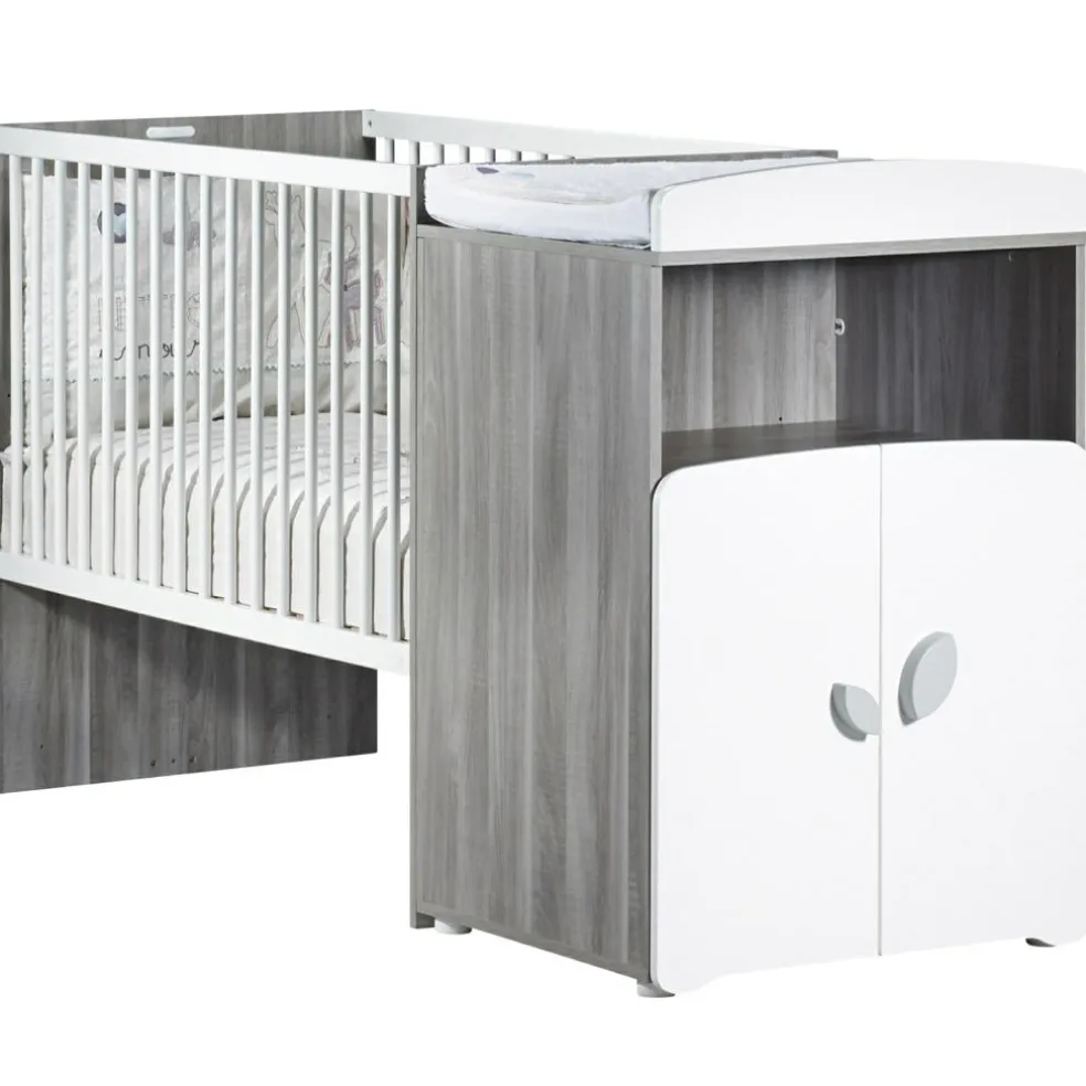 – Lit bébé 60 x 120 cm et commode à langer à utiliser soit en bloc compact, soit dissociés l’un de l’autre.