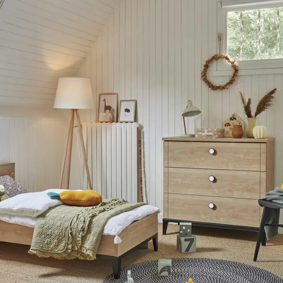 Chic mais aussi pratique, le lit transformable Marcel ! Le sommier en hêtre massif et ses lattes en multiplis de hêtre sont réglables en deux positions. Adoptez la position haute pour le nouveau-né, vous éviterez ainsi de vous faire mal au dos pour accéder au berceau. Lorsqu’il grandit et commence à s’agiter un peu plus, réglez le sommier en position basse. Pour freiner votre petit bout dans son désir d’explorer le nouveau monde qui s’offre à lui, deux barrières fixes à une position en hêtre laqué noir équipent ce lit de bébé.