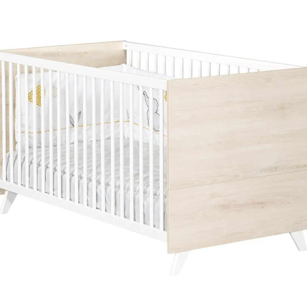 – Lit bébé à barreaux 70 x 140 cm, évolutif en lit junior sans barreaux 70 x 140 cm (pour les 3-7 ans).