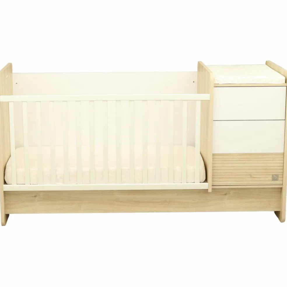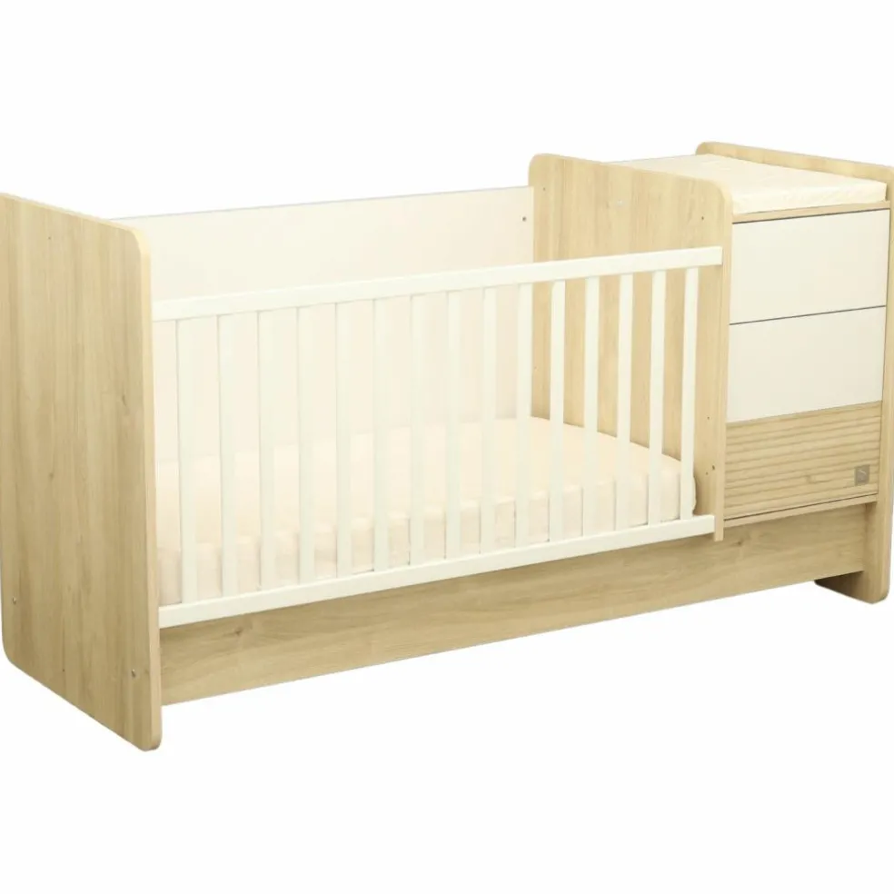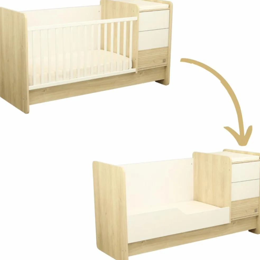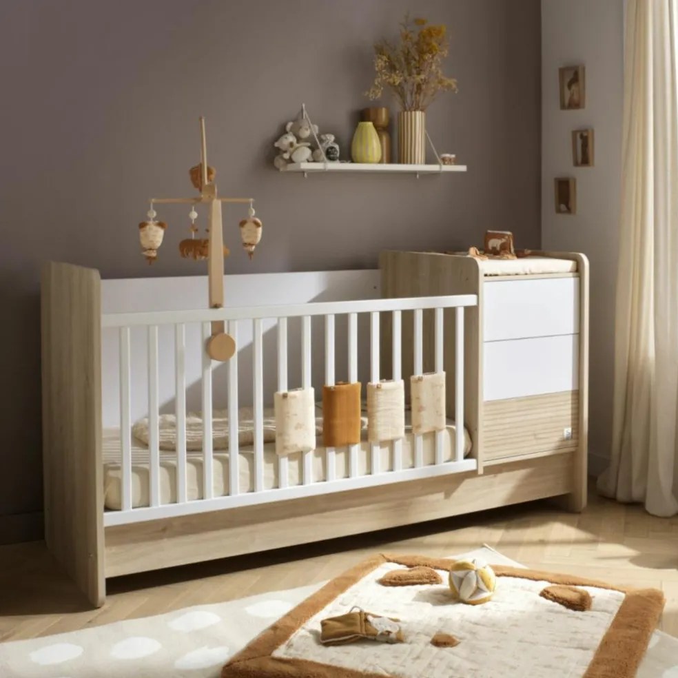 – Évolutif et intelligent : Un meuble 3-en-1 qui fait lit bébé, table à langer avec rangements, lit junior et bureau.