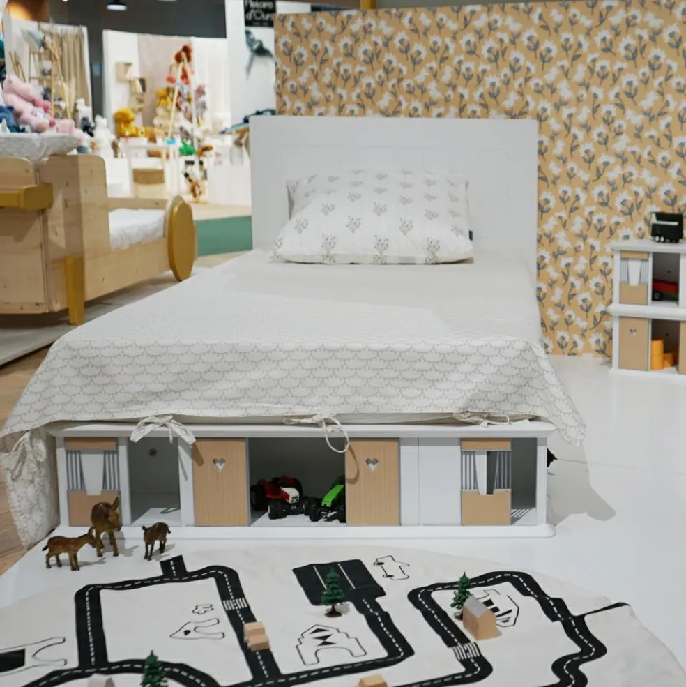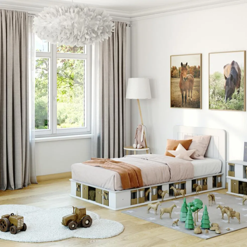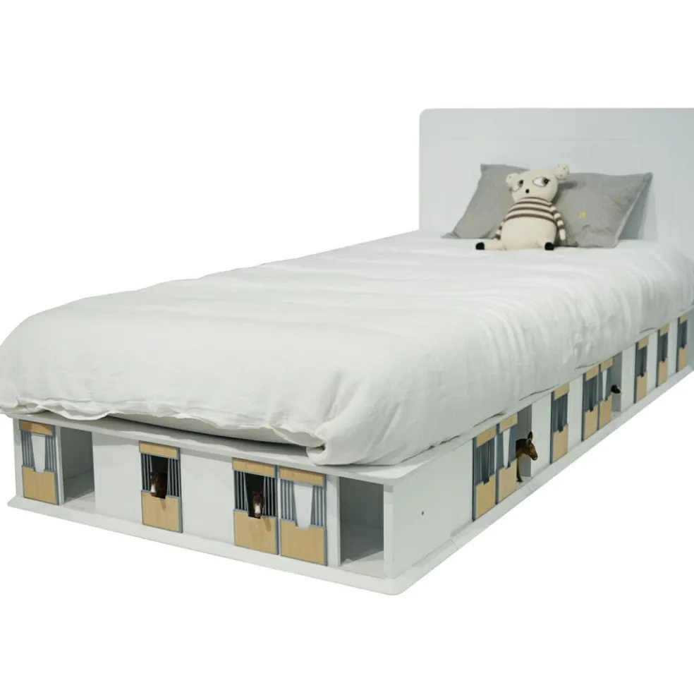 – Les boxes pour les chevaux et les portes de grange permettent à l’enfant de jouer autour du lit.