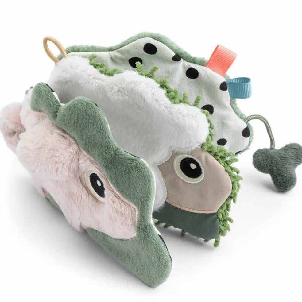 – Bébé découvrira des éléments sensoriels comme du papier bruissant, des perles et différentes textures qui stimuleront son ouïe et son sens du toucher.