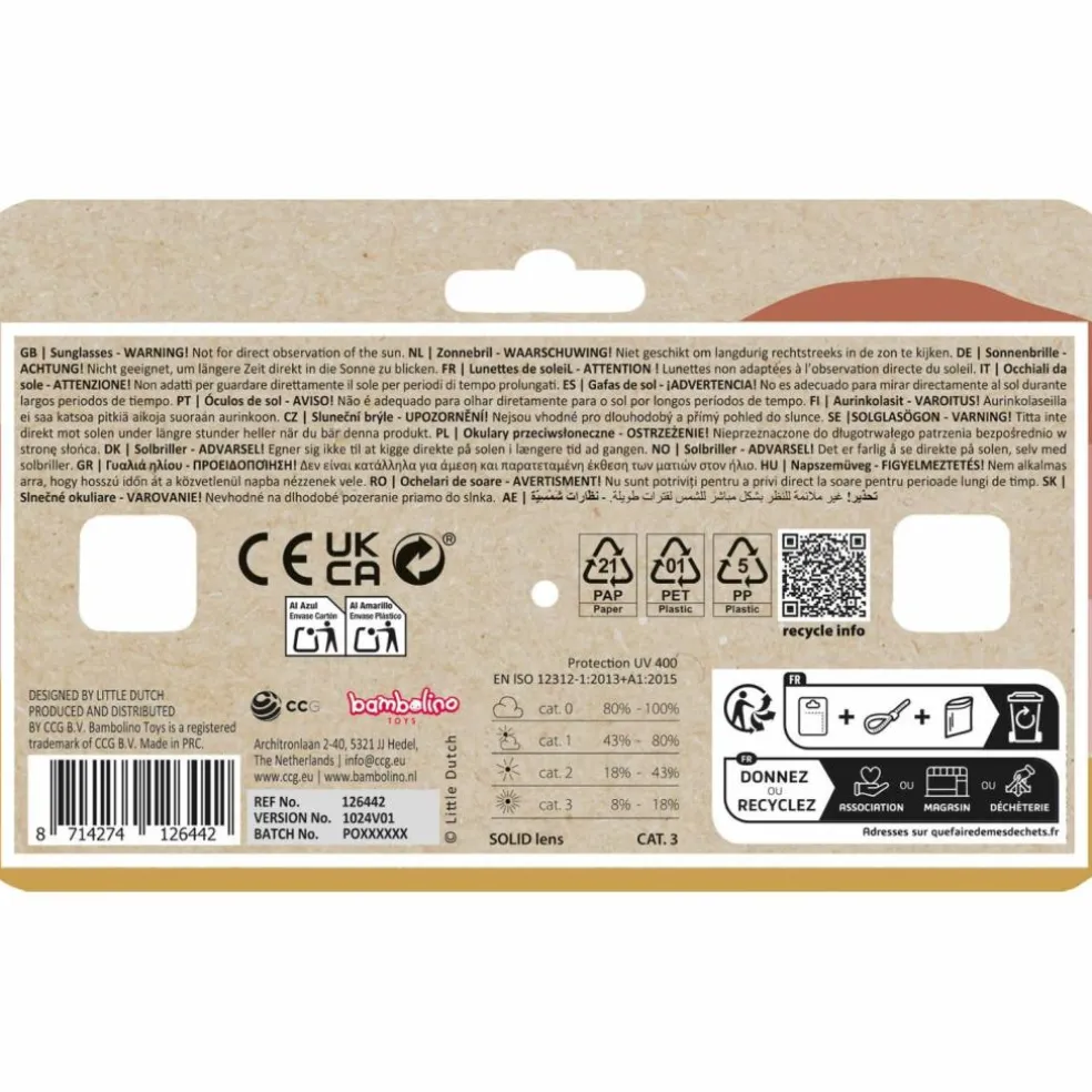 – Les lunettes ont un filtre UV 400 (catégorie 3), qui protège les yeux de votre enfant du soleil.